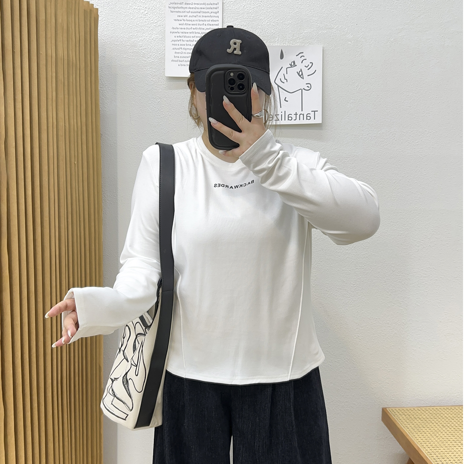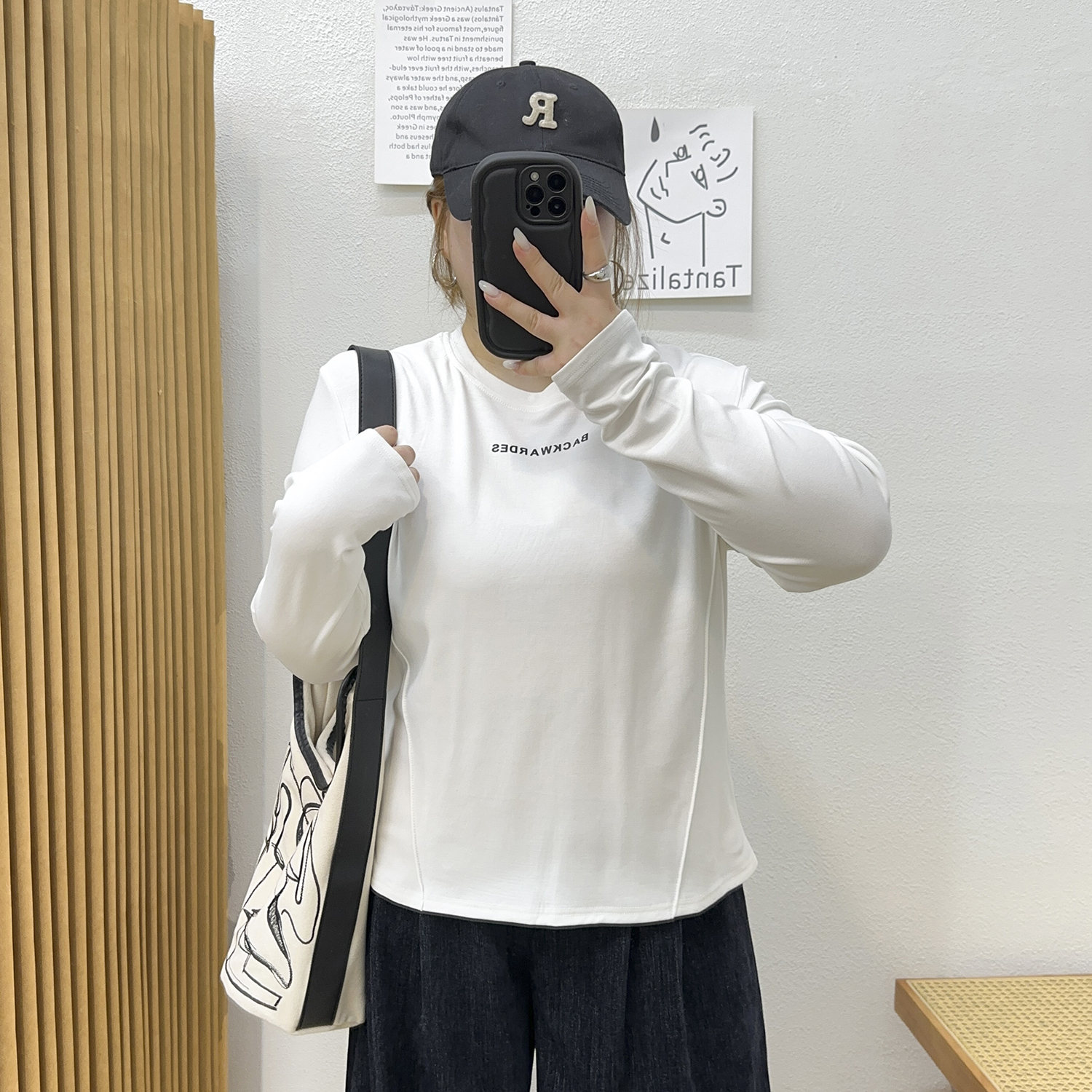 大码胖mm不规则磨毛长袖t恤女早秋美式字母修身显瘦遮肚短款上衣