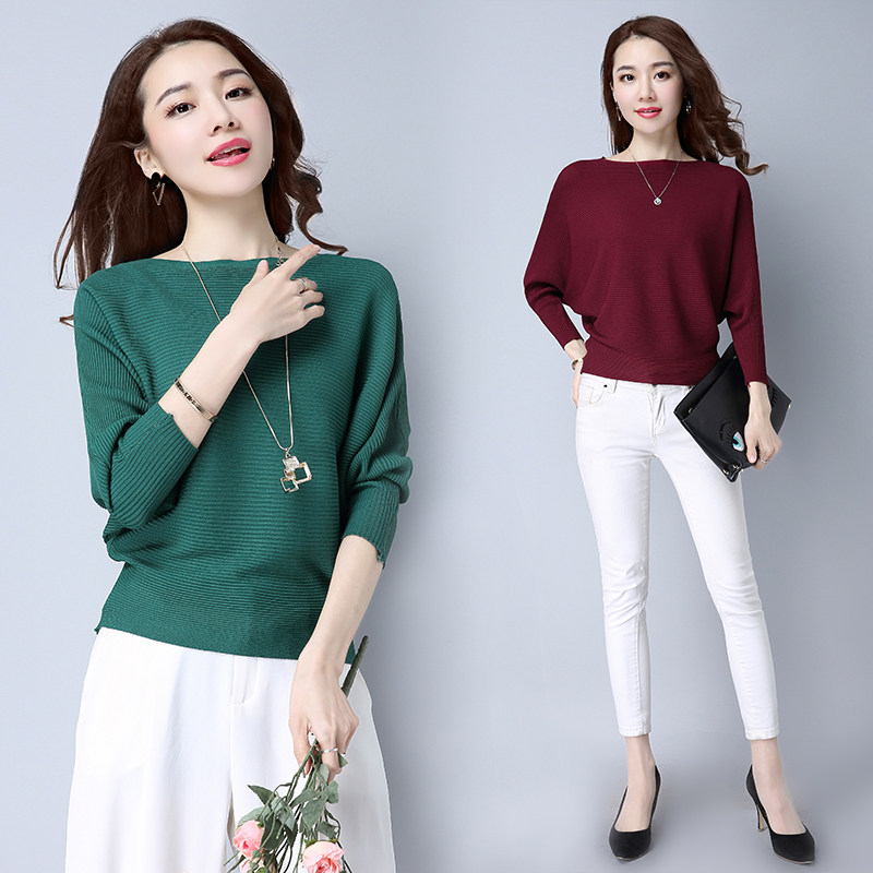 春秋新款宽松短款针织衫毛衣打底女纯色显瘦蝙蝠袖一字领套头上衣