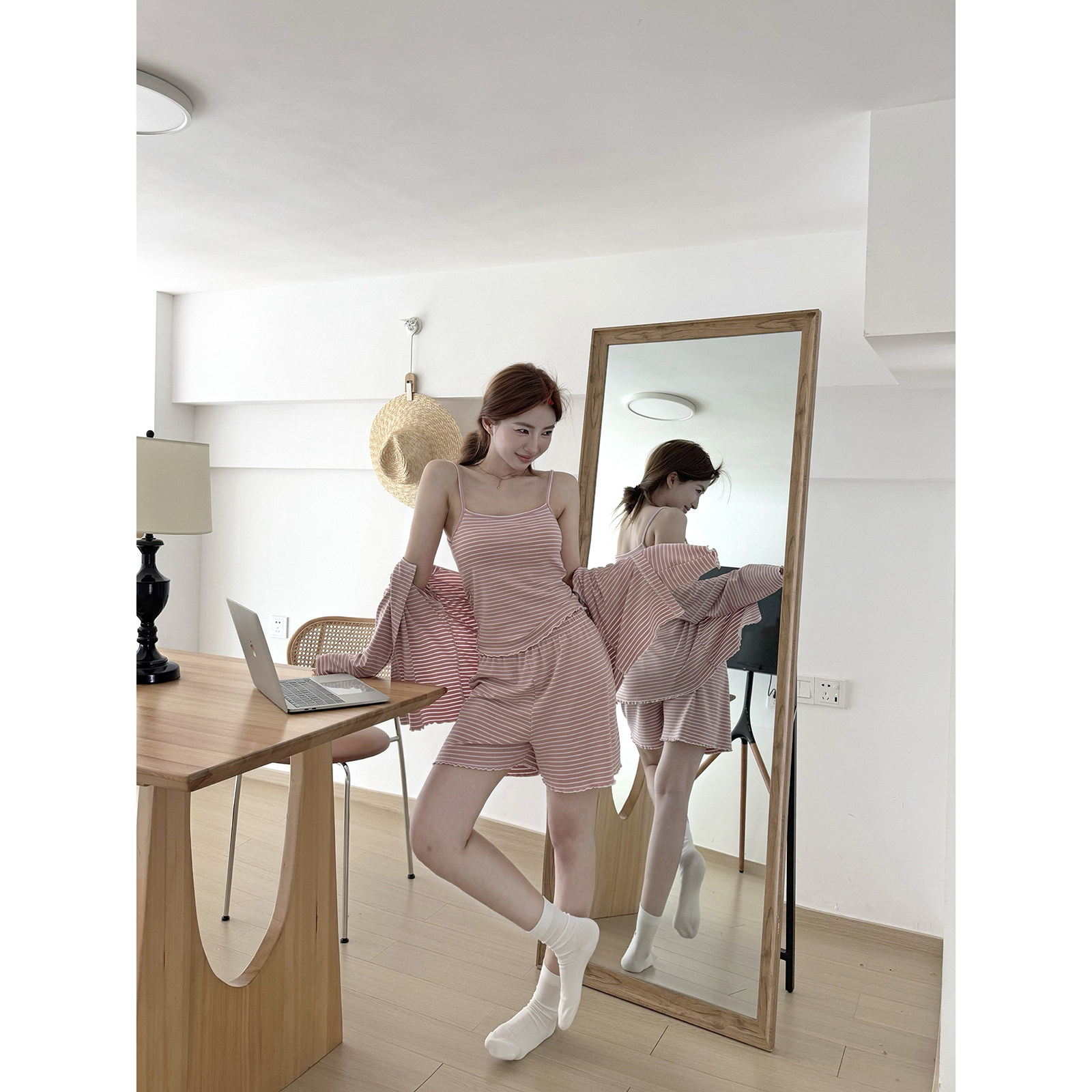 JoyceBra韩系慵懒条纹带胸垫吊带睡衣女夏季甜美家居服套装三件套