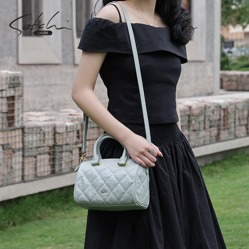 SATCHI沙驰波士顿包女2025新款菱格真皮单肩斜挎包轻奢通勤手提包