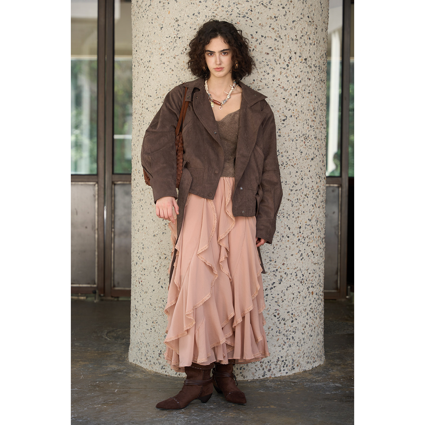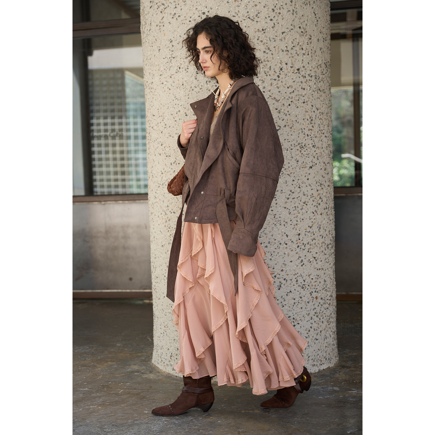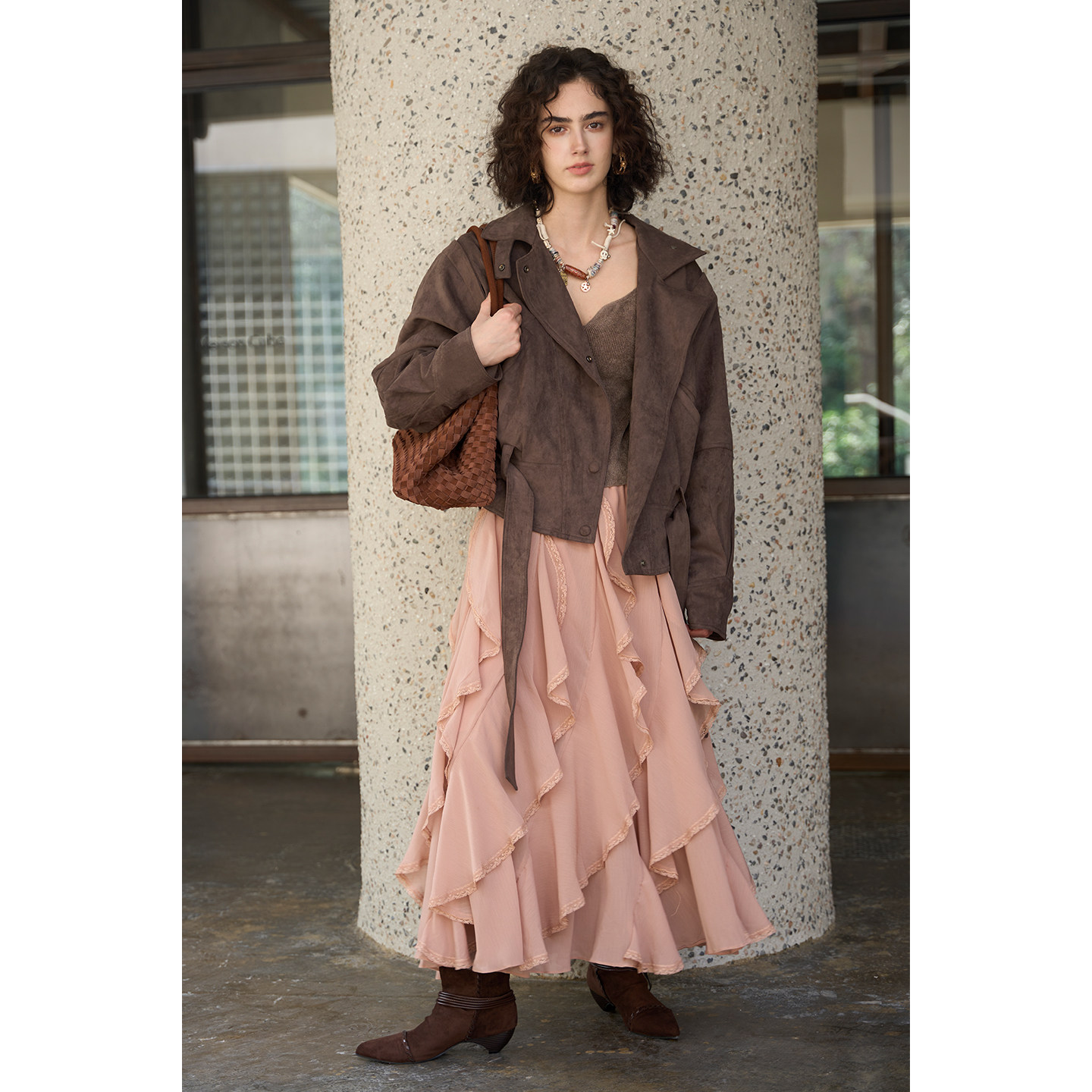 Miorastudio法式复古不规则蕾丝拼接粉色半身裙高腰荷叶边长裙子