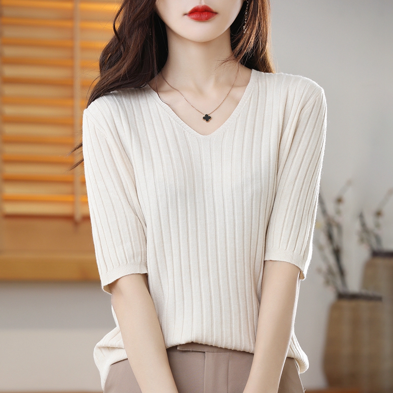 2025年新款百搭七分袖短袖T恤修身抽条女士针织衫显瘦打底外穿
