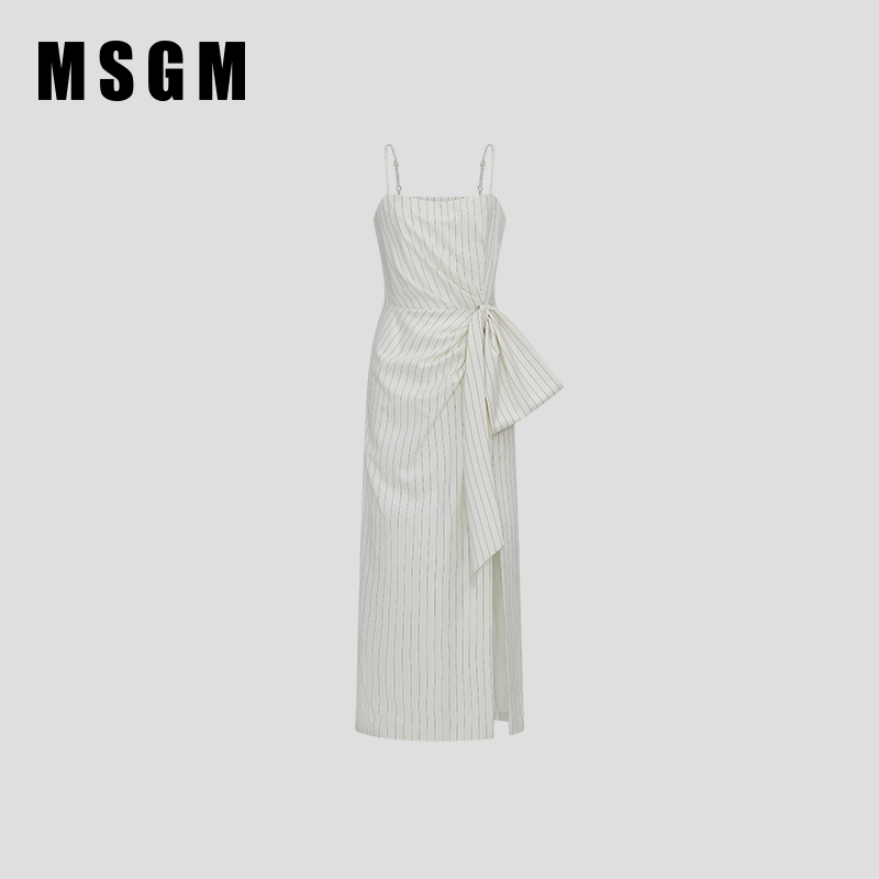 【明星同款】MSGM春夏女士收腰蝴蝶结系带侧开叉吊带条纹连衣裙