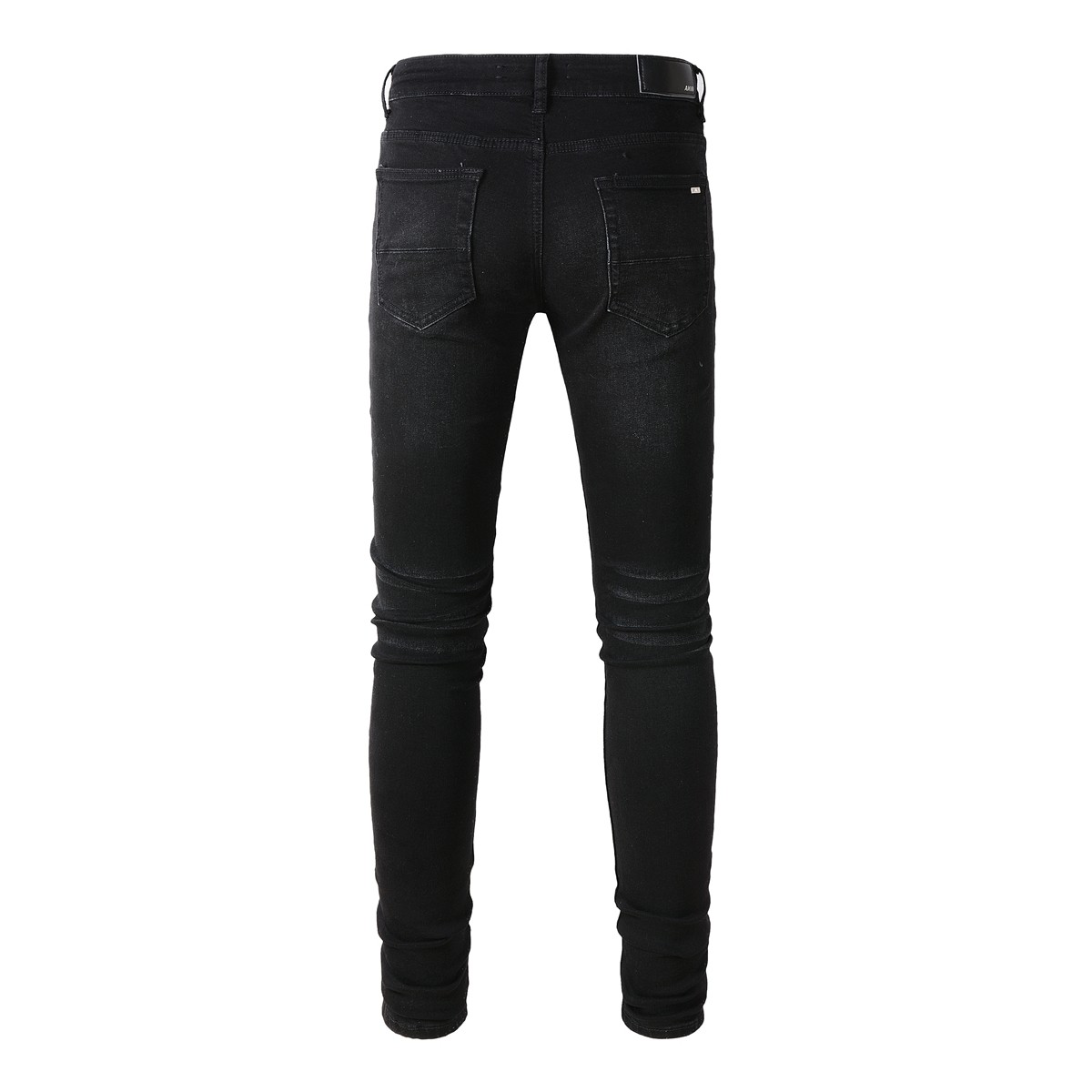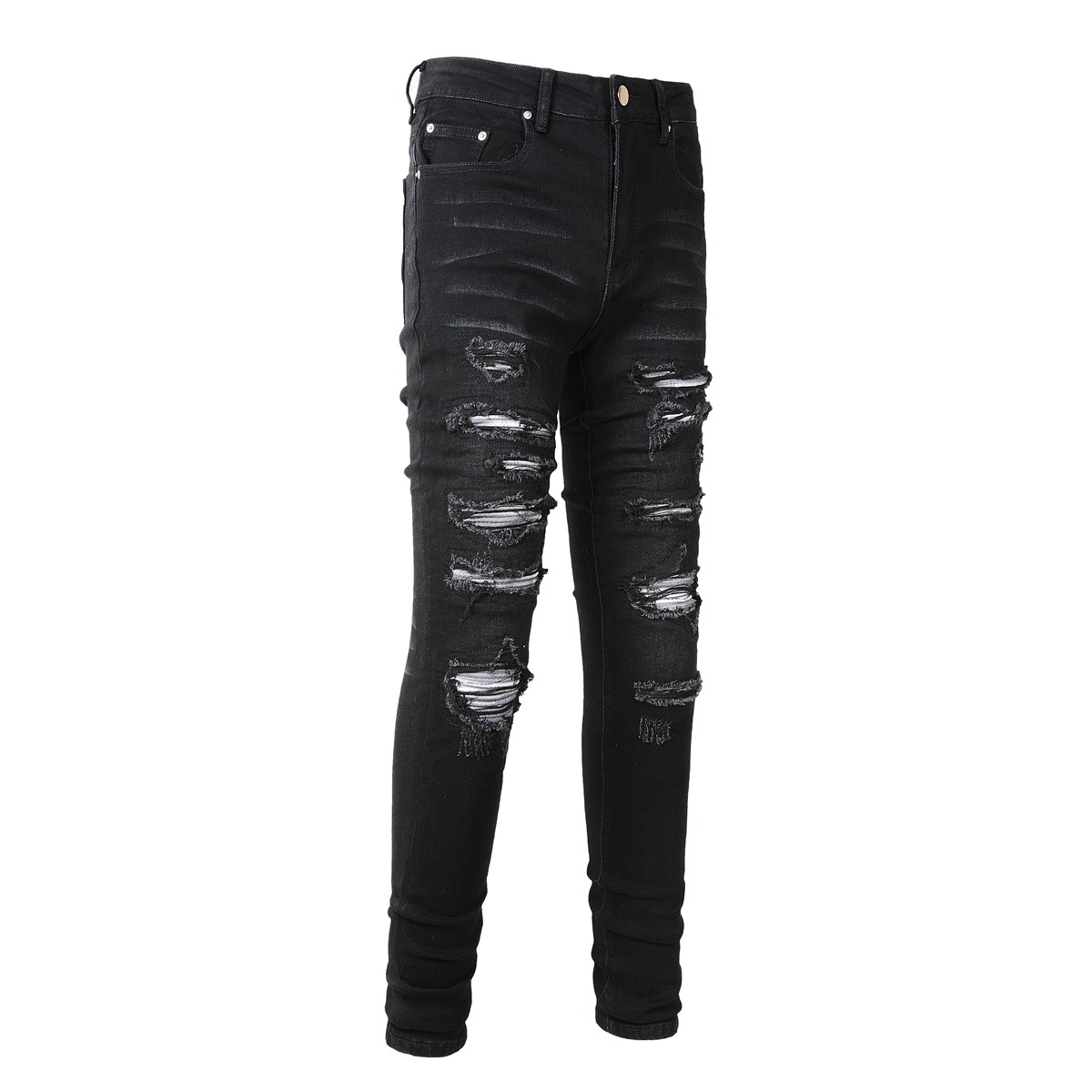 高街潮牌AMR春季新款黑色大破洞补丁牛仔裤男弹力修身显瘦小脚裤