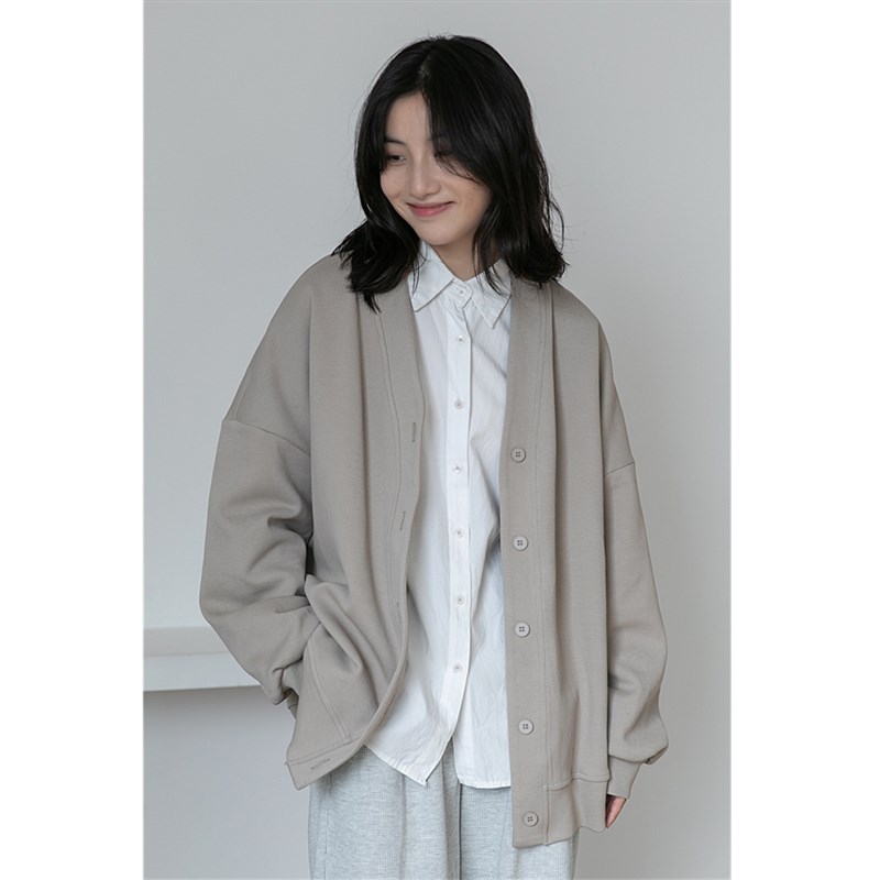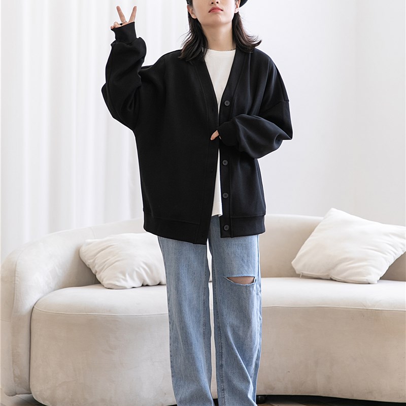 2023春秋新款休闲百搭宽松V领中长版加绒卫衣开衫外套叠穿上衣女