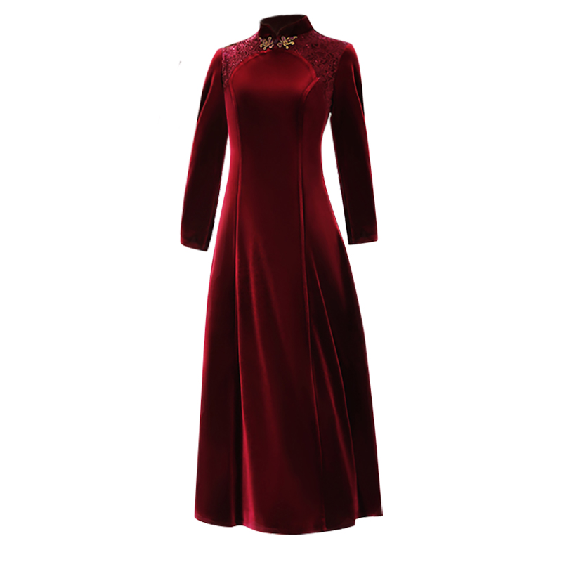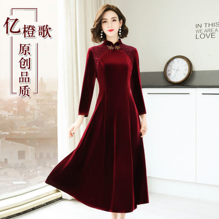 中年红色礼服连衣裙丝绒旗袍裙中长款参加婚宴喜婆婆妈妈平时可穿