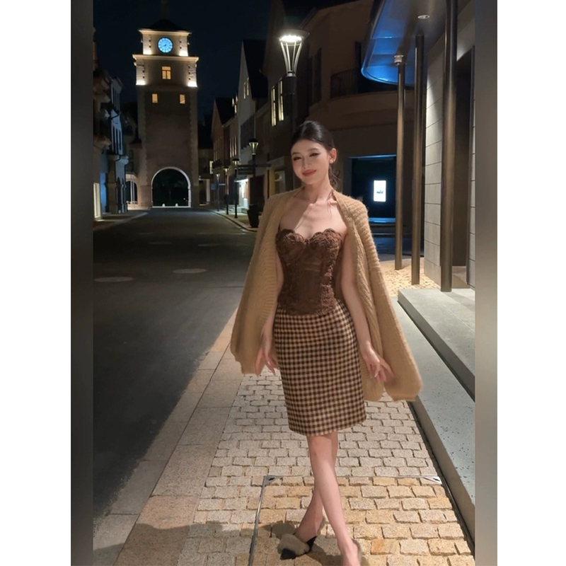 XZY 微胖温柔慵懒风针织开衫蕾丝抹胸女25年冬季高腰格纹半裙套装
