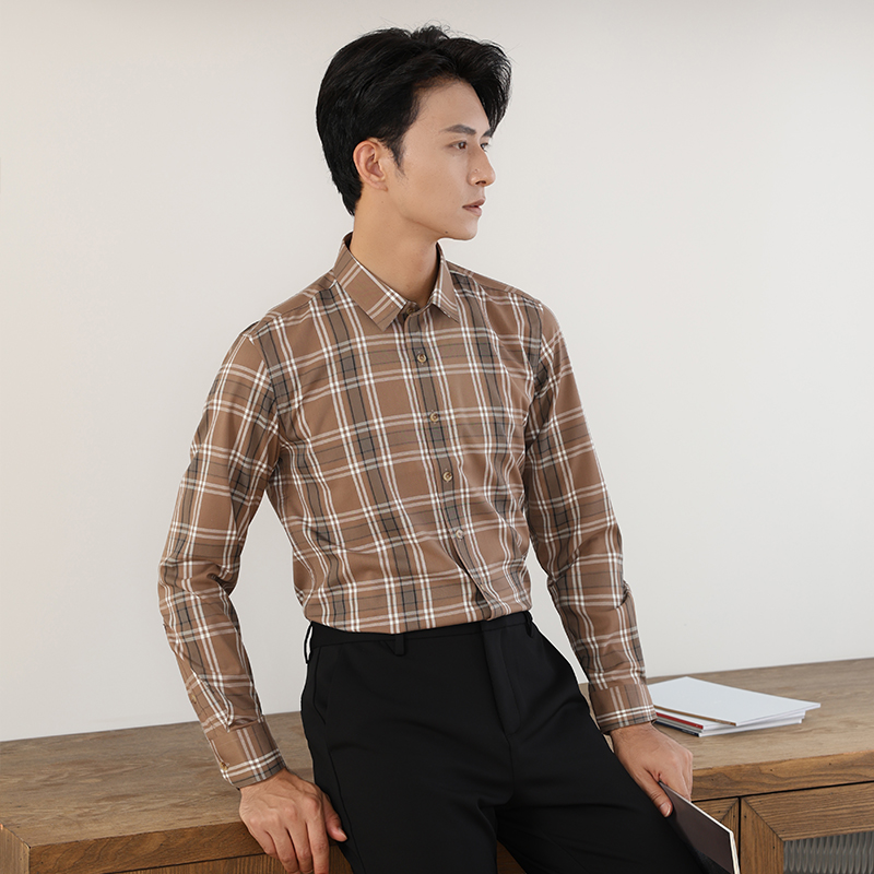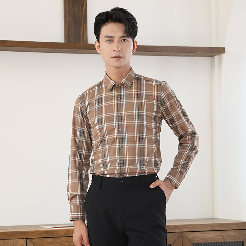 乔治白男士秋季棕灰白黑格修身尖领微弹长袖衬衫商务休闲通勤上衣