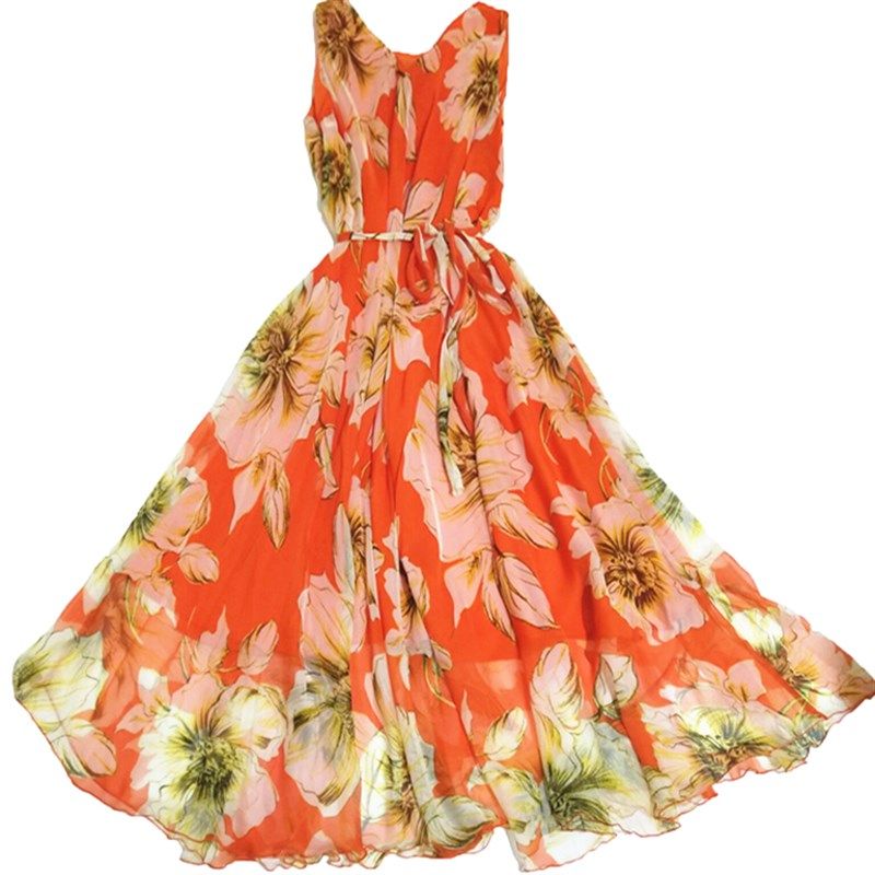 沙滩裙女夏海边度假雪纺碎花连衣裙气质无袖大摆波西米亚长裙大码