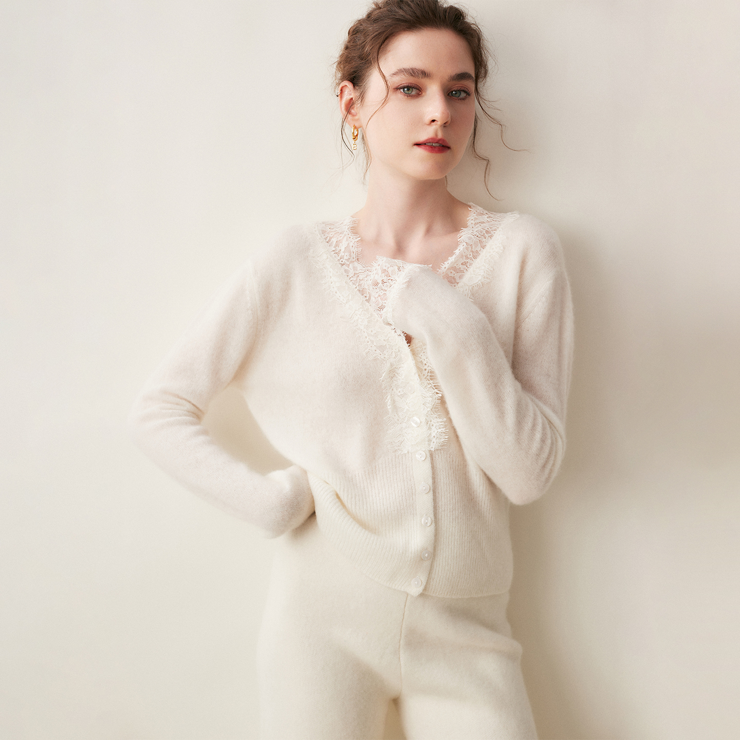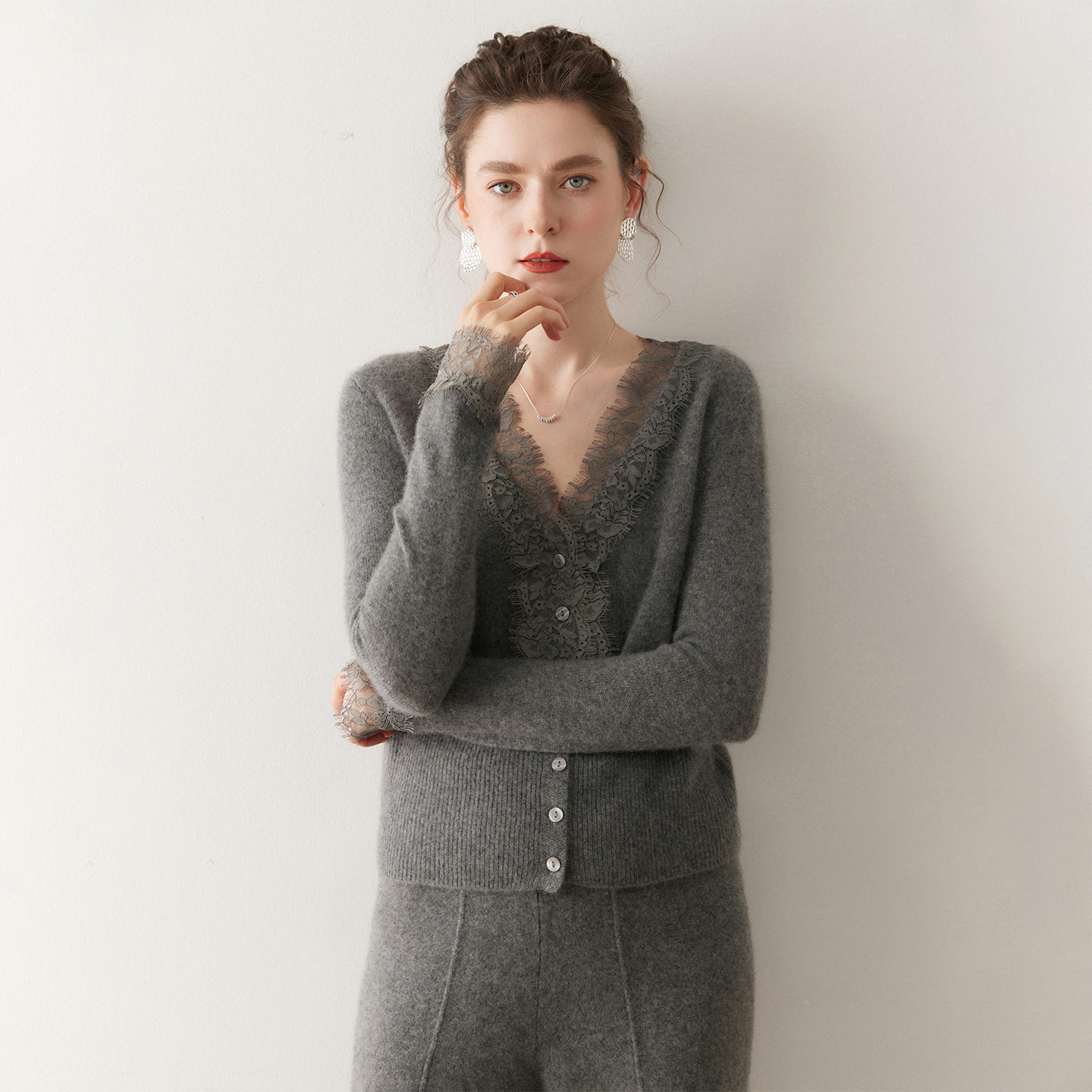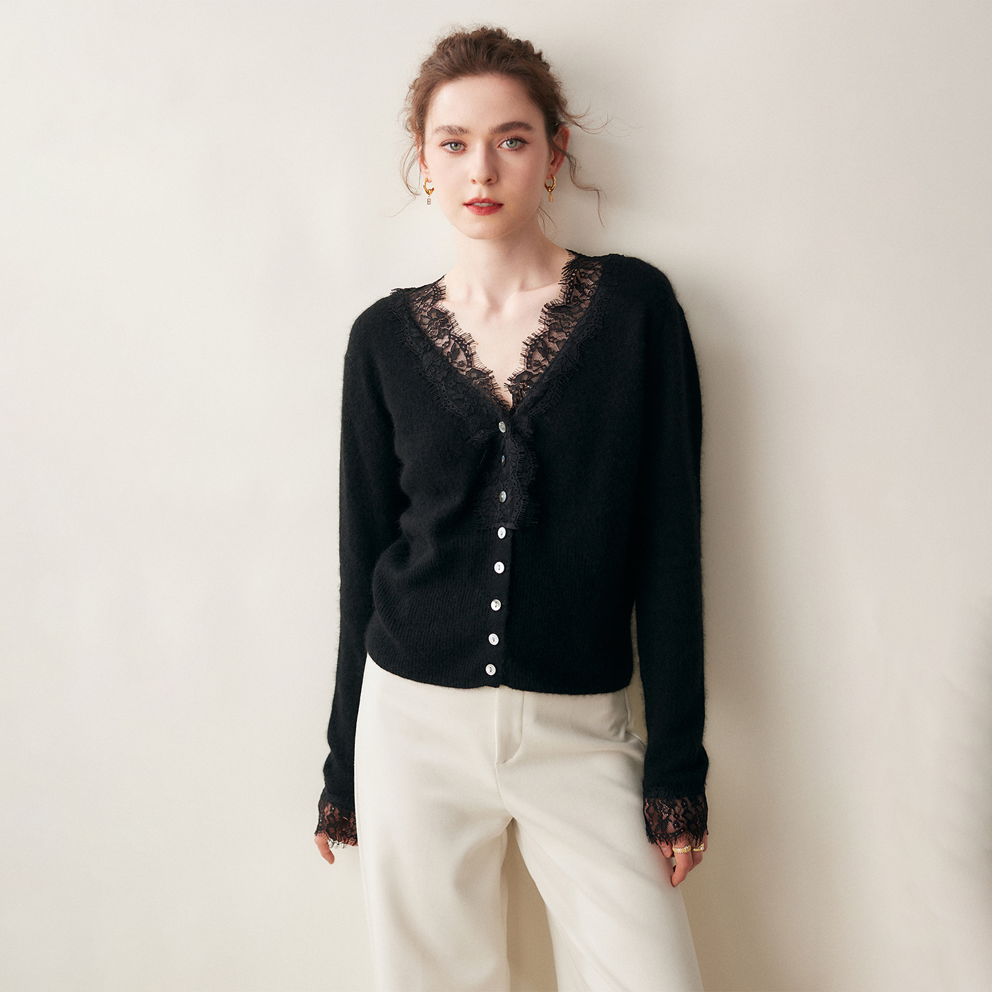 蕾丝花边V领山羊绒开衫女2025秋季欧货高端气质长袖毛衣针织外套