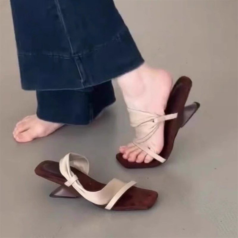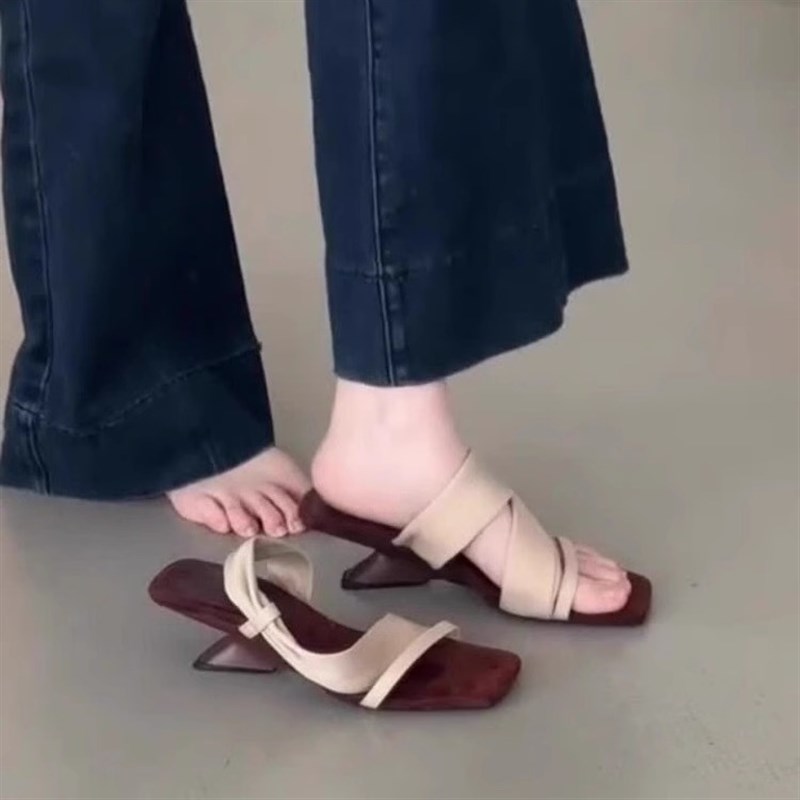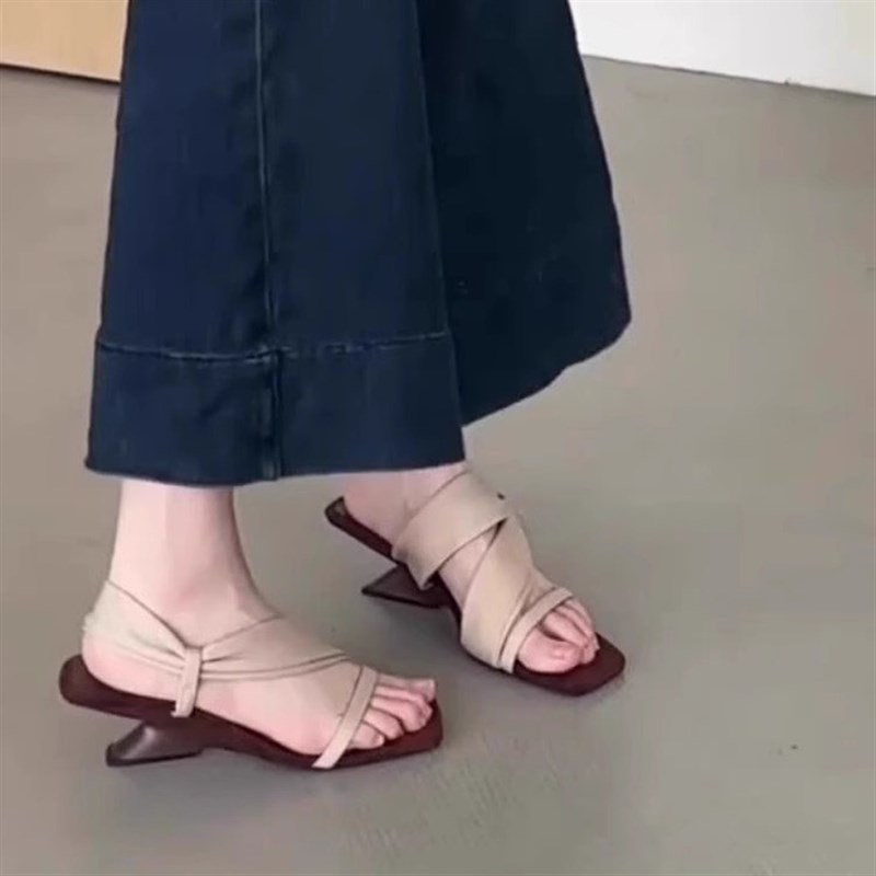 羊皮版!方头绒面一字带坡跟凉鞋女夏外穿露趾复古绕带高跟凉拖鞋