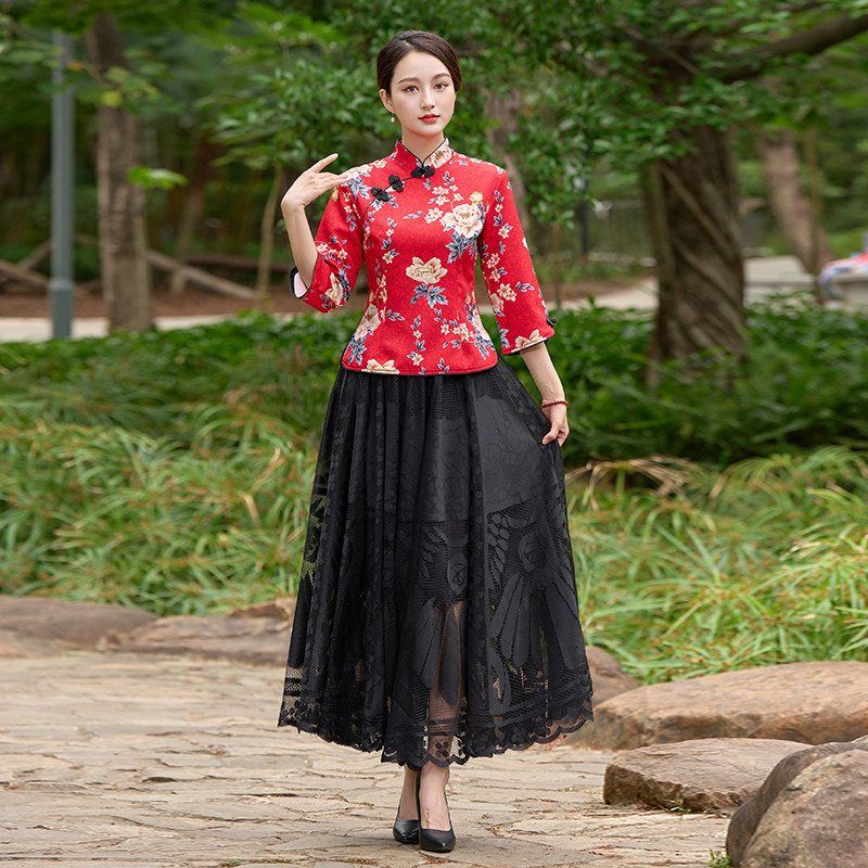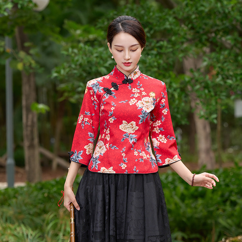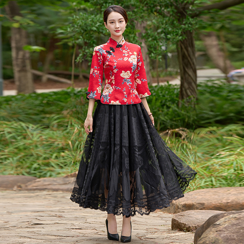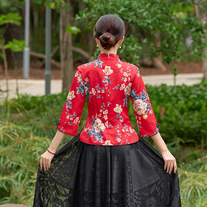 夏季女士两件套旗袍上衣印花薄款透气改良唐装红色广场舞表演服装