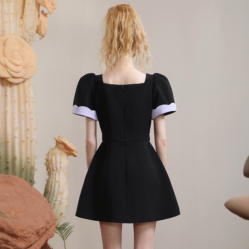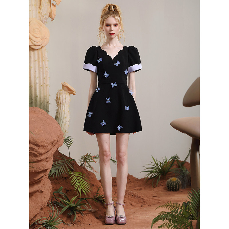 茬客轻熟黑色连衣裙女气质优雅浪漫文艺花瓣V领时尚通勤蝴蝶裙子