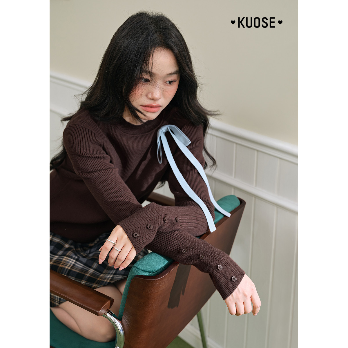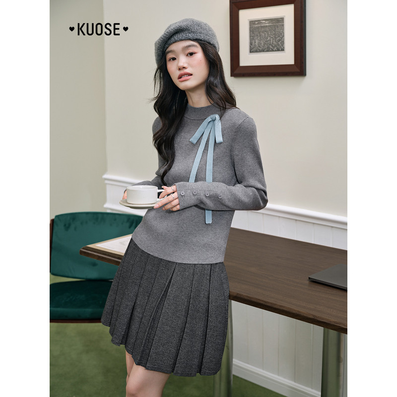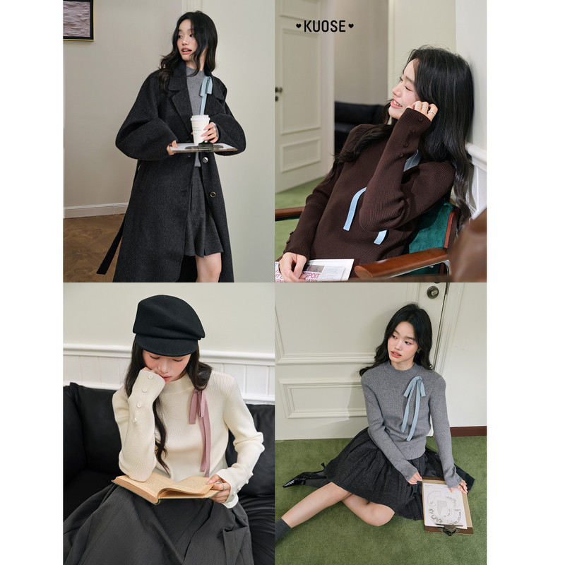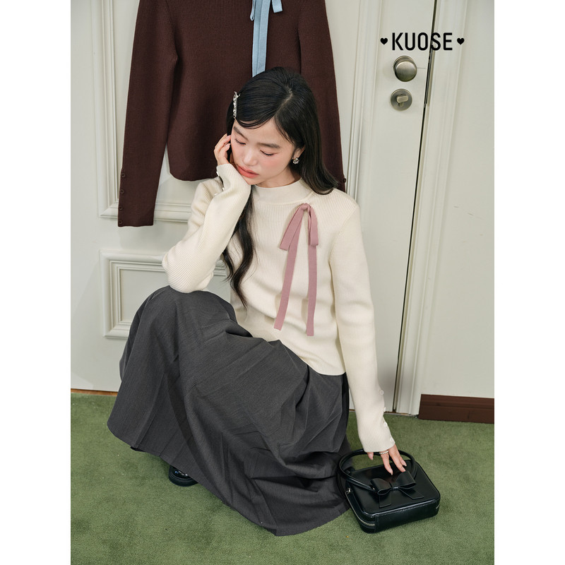 阔色灰色蝴蝶结半高领长袖针织衫打底毛衣25秋冬季新款女上衣杏色