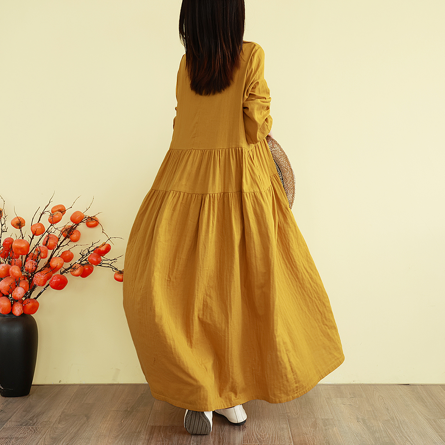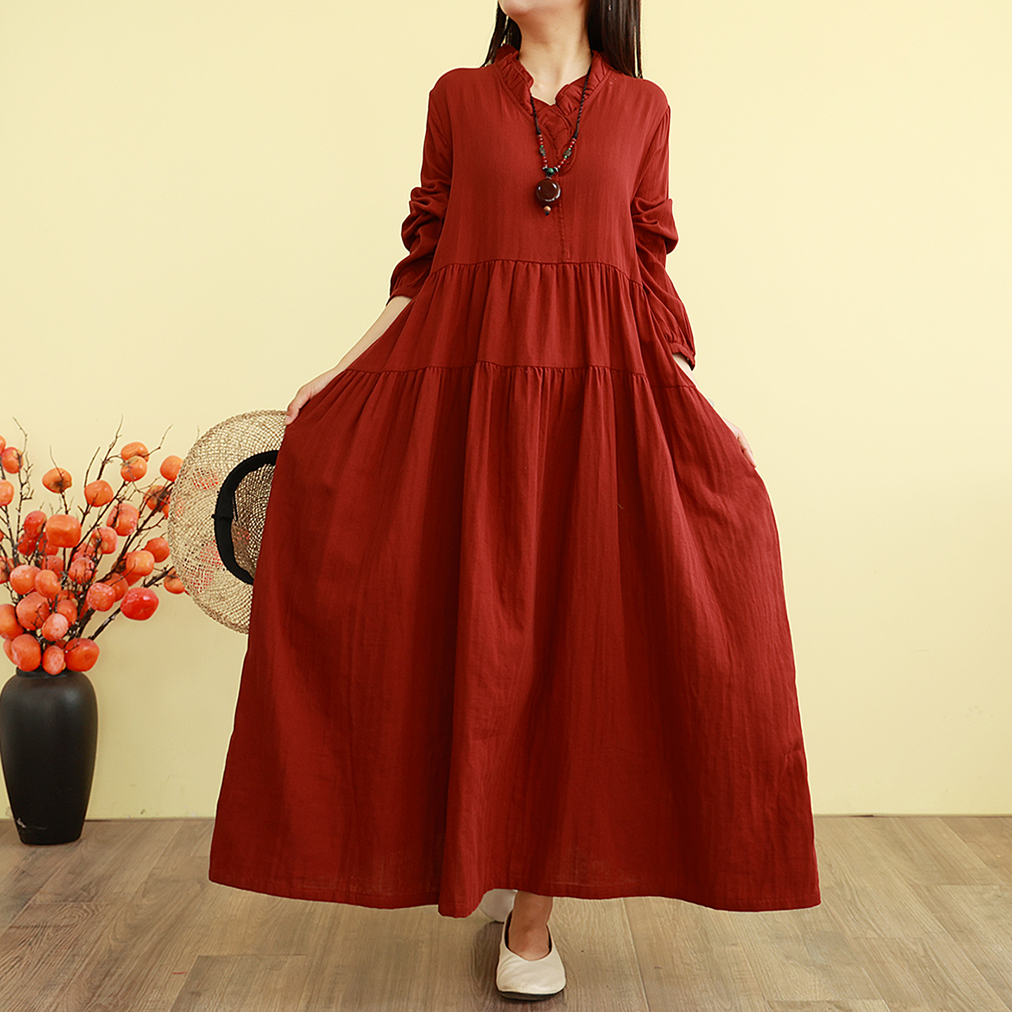 文艺复古棉麻连衣裙秋季森系纯色百搭超长款过膝大摆气质裙子宽松