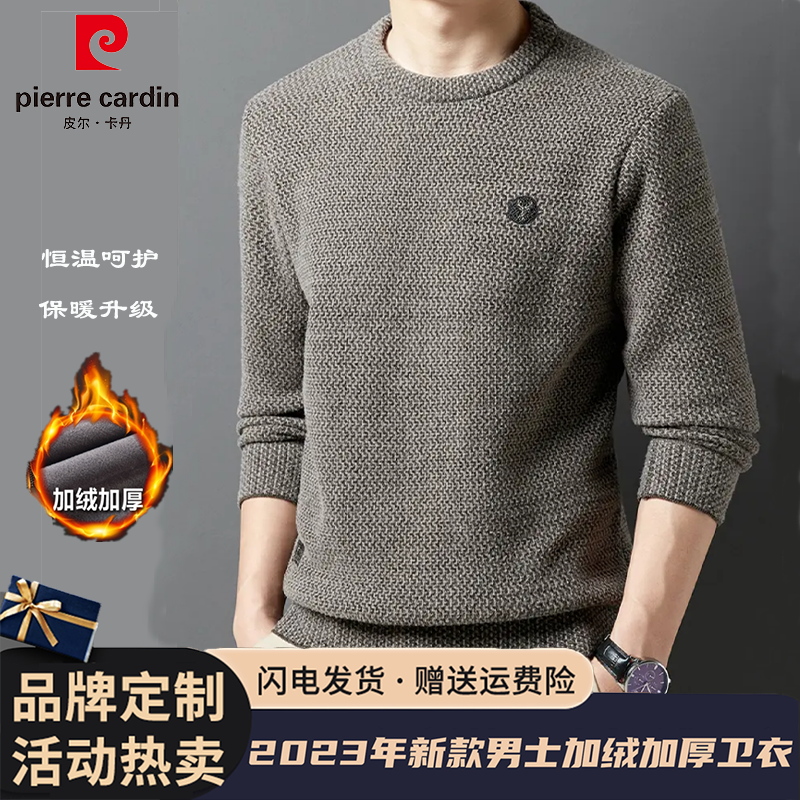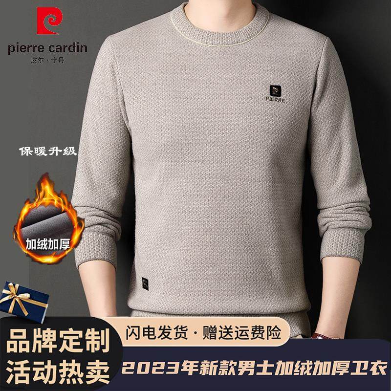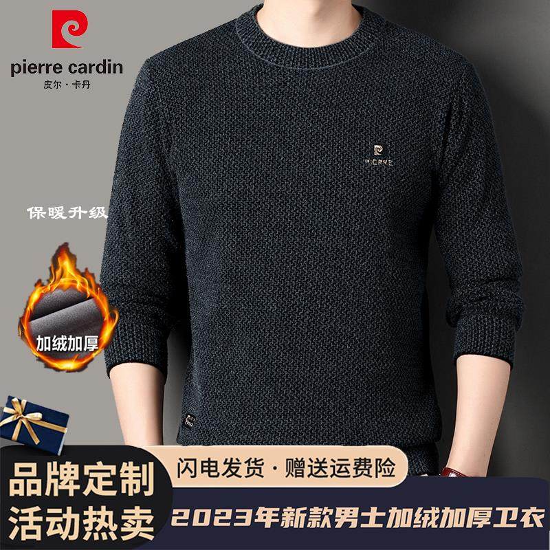 皮尔卡丹秋冬新款男士雪貂绒毛衣圆领加绒加厚针织衫保暖打底卫衣