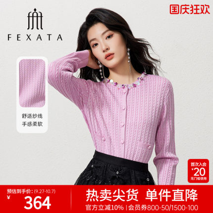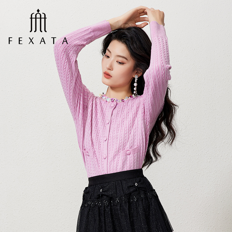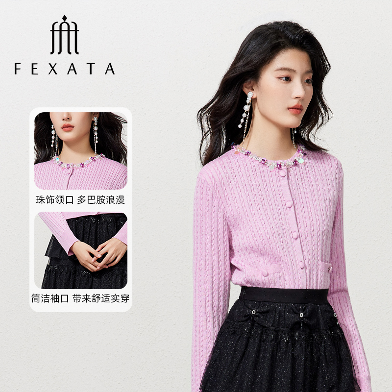 FEXATA斐格思2025秋季新款浪漫多巴胺钉珠肌理感毛针织开衫短外套