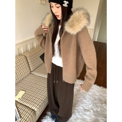 NAZ那子大码秋冬可拆定染毛领连帽显瘦毛衣胖mm气质时尚外搭开衫