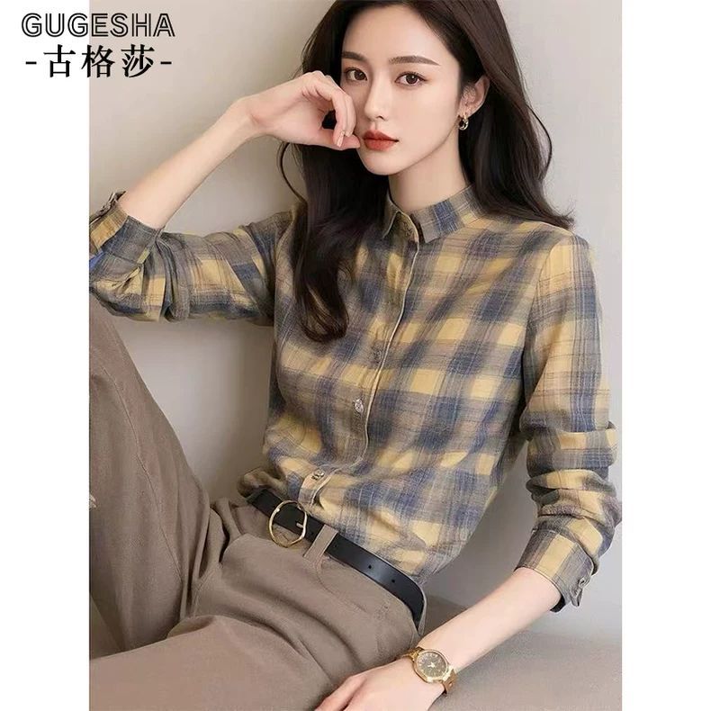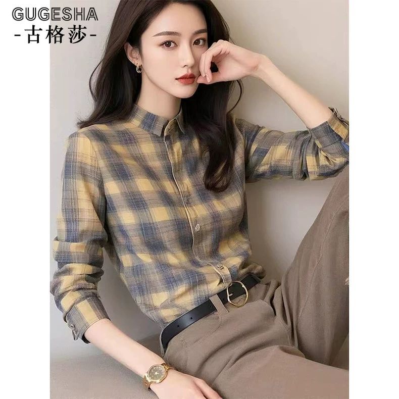 法式复古格纹Polo长袖衬衫女2025春装款显瘦通勤小衫独特格子上衣