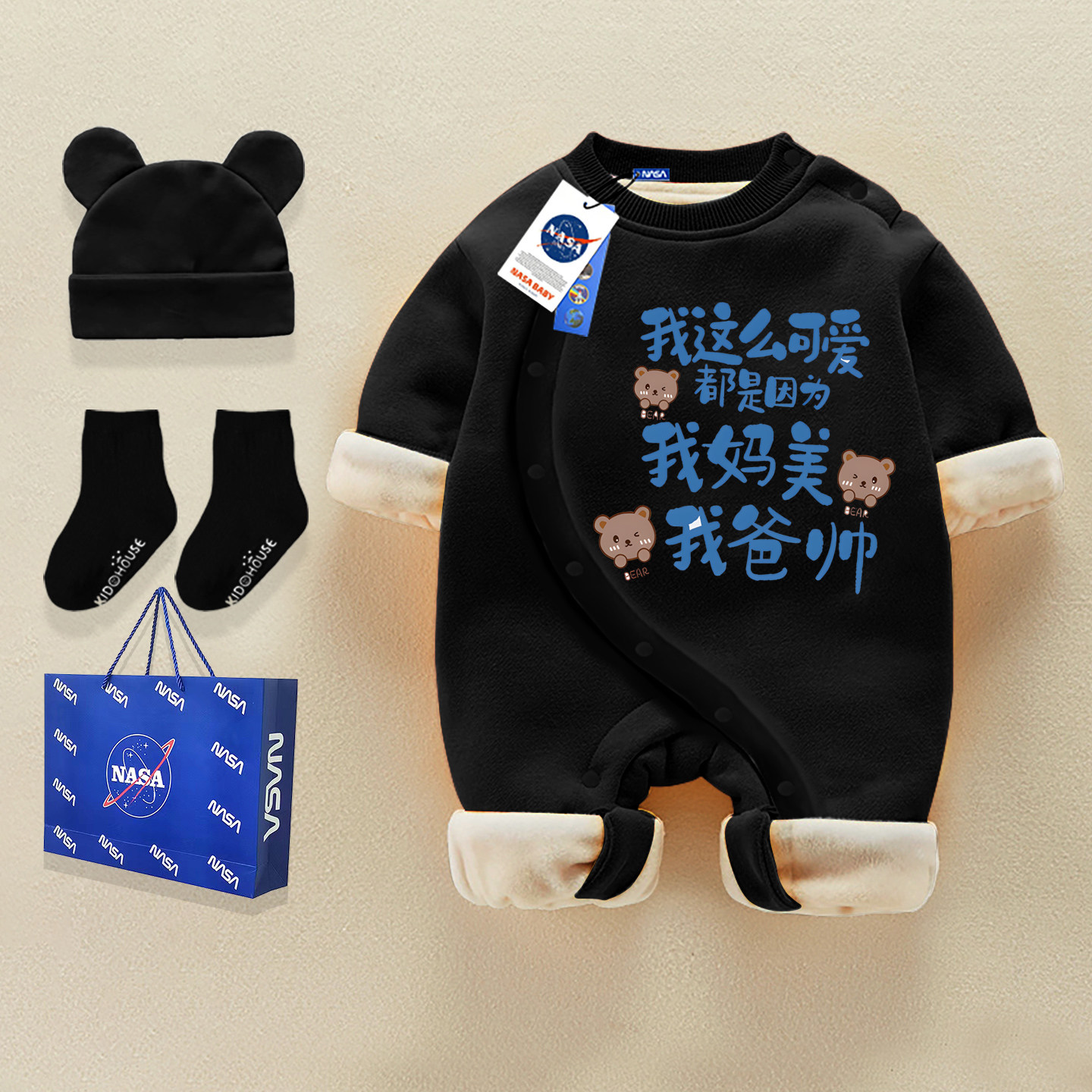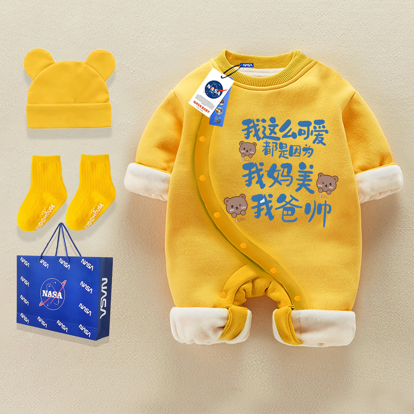 冬季婴儿服加绒加厚长袖连体衣搞笑我爱我妈纯棉a类宝宝侧开开衫