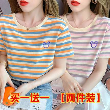 妈妈夏装新款刺绣韩版大码短袖T恤女装宽松减龄条纹遮肚显瘦上衣