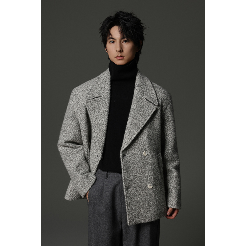 W2X高端行政男士冬款纯毛双排扣风衣长款双面呢黑色毛呢大衣外套