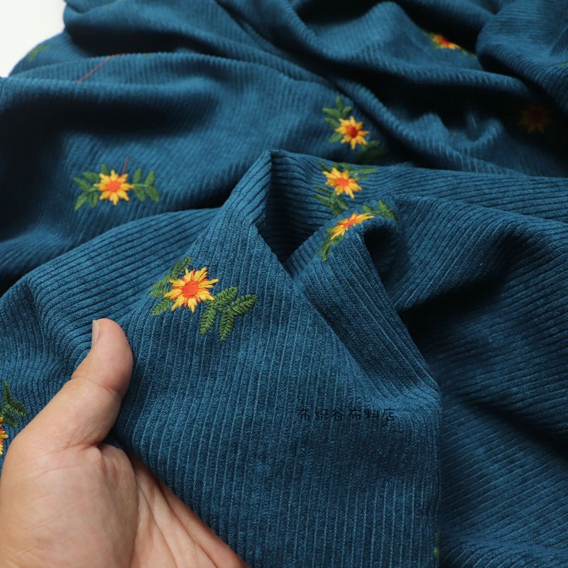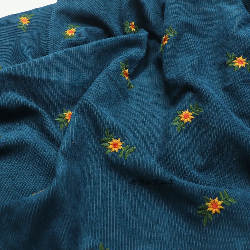 石英蓝刺绣花涤纶灯芯绒服装布料