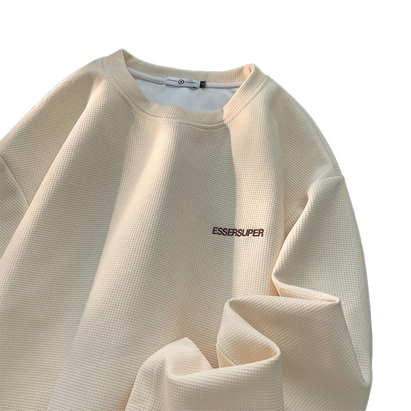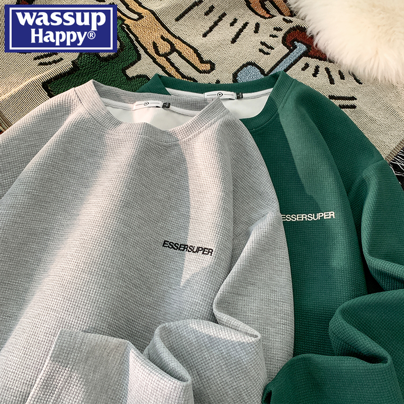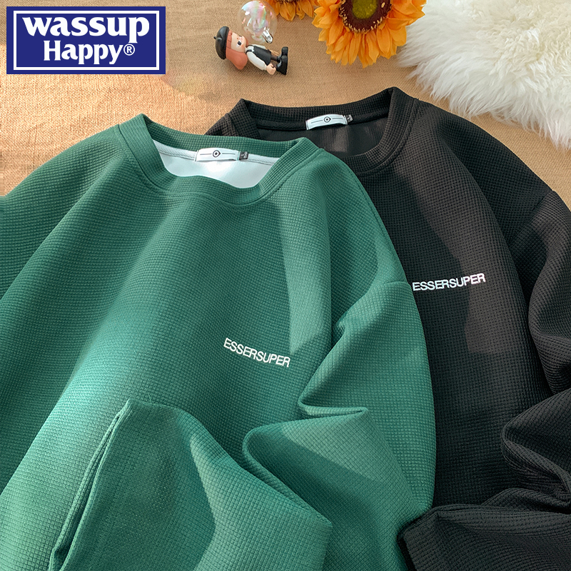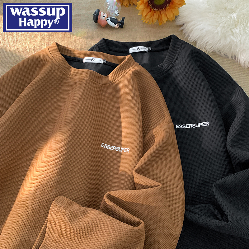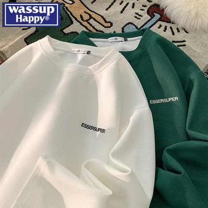wassup happy华夫格长袖t恤男春秋季潮流刺绣宽松打底衫休闲上衣