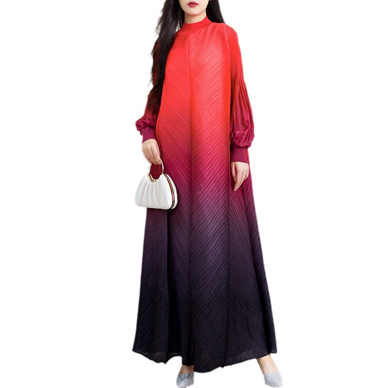 2024年中东褶皱渐变色长裙女装时尚气质宽松大码长袖立领连衣裙