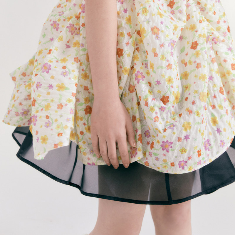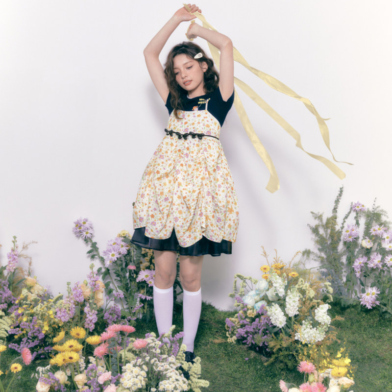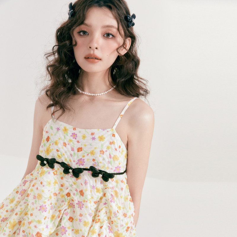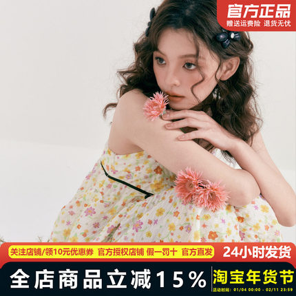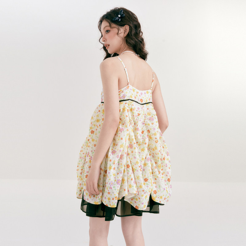 乐町设计感碎花吊带裙夏季碎花网纱短款少女鬼马轻盈蓬蓬连衣裙