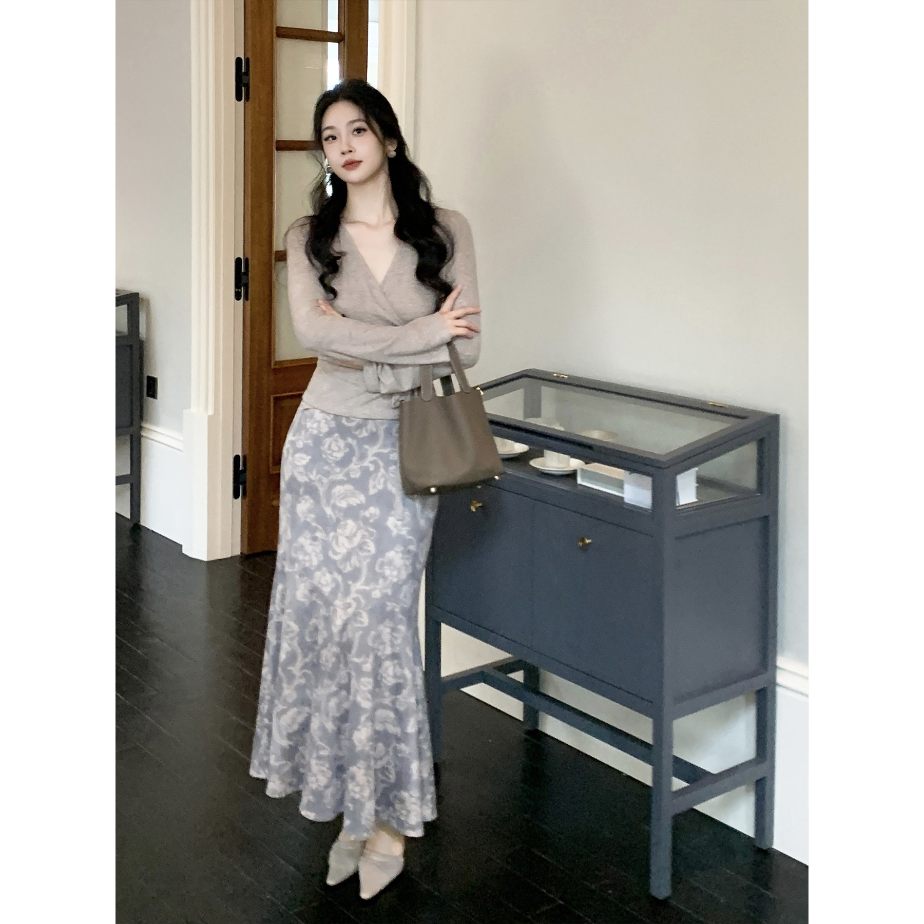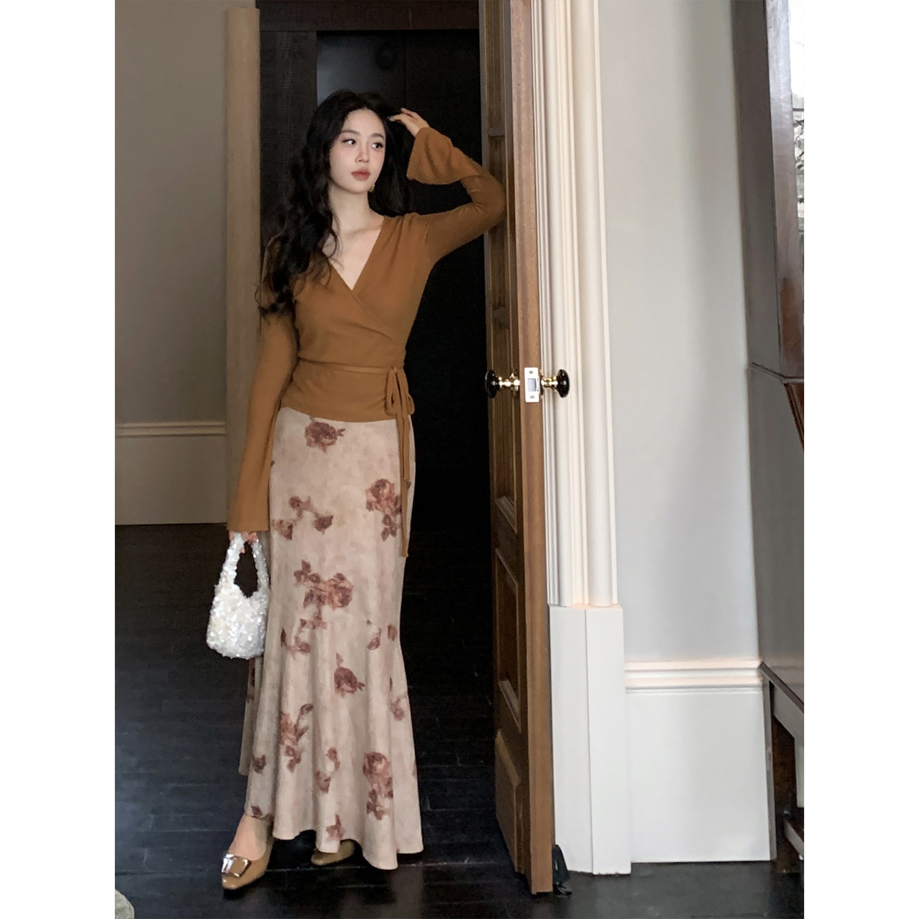 【夕照】SYT自制时髦显瘦高腰花朵半身裙女秋季新款A字印花鱼尾裙