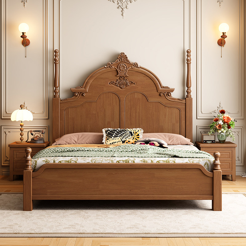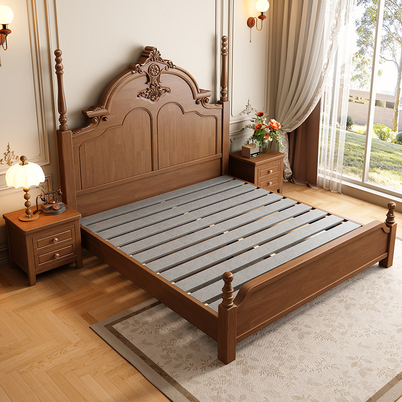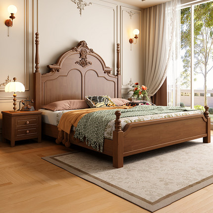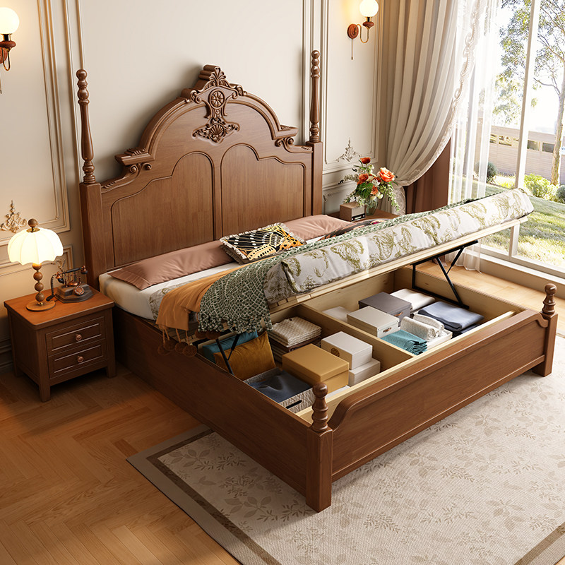 美式中古风实木床1.5米单人1.8米双人主卧室床榫卯满铺高箱储物床
