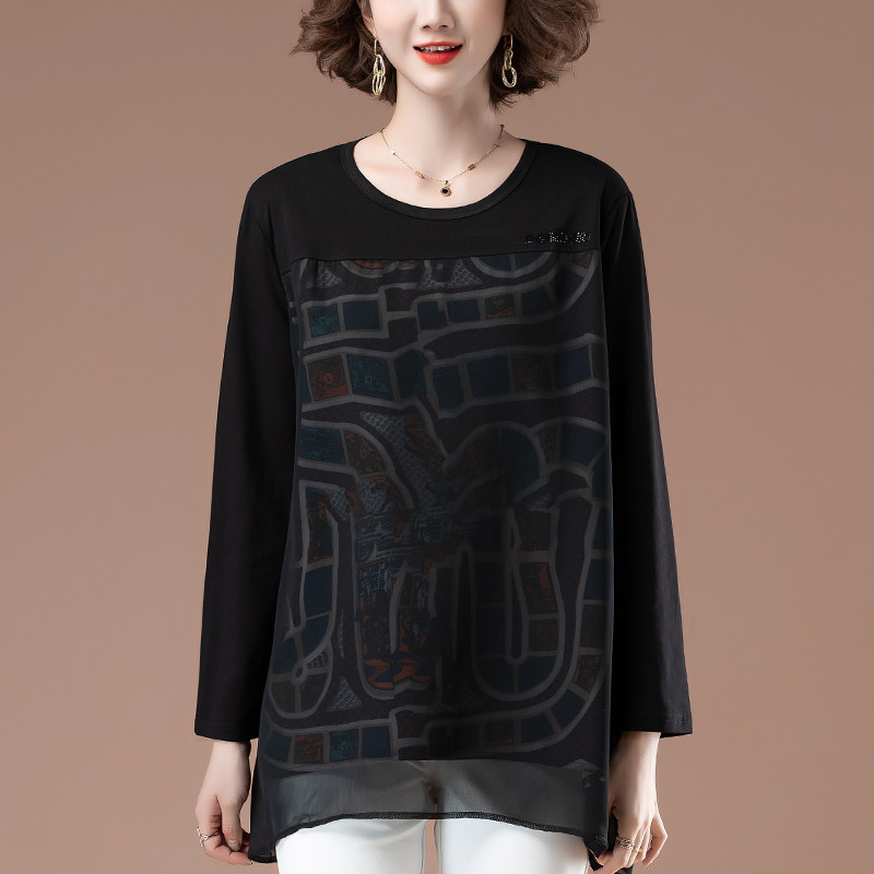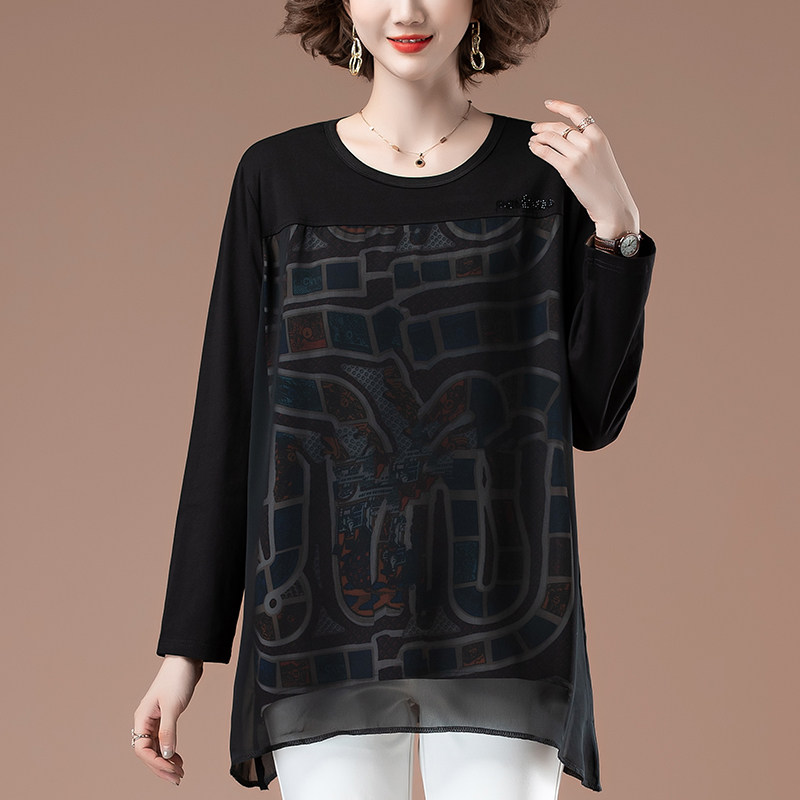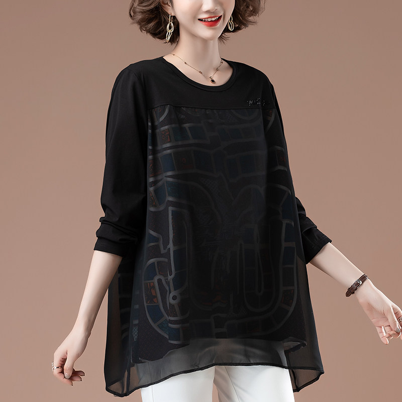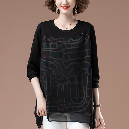 雪纺衫女长袖春秋加肥加大码女装宽松中年妈妈洋气拼接显瘦打底衫