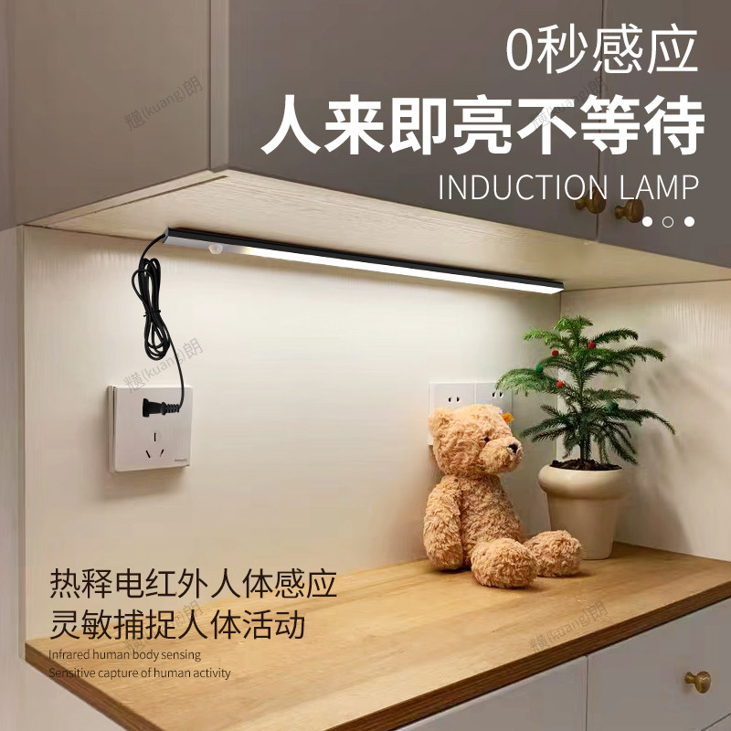 黑色220伏插电人体感应灯条LED自然光走廊镜前床底柜长条自粘灯带