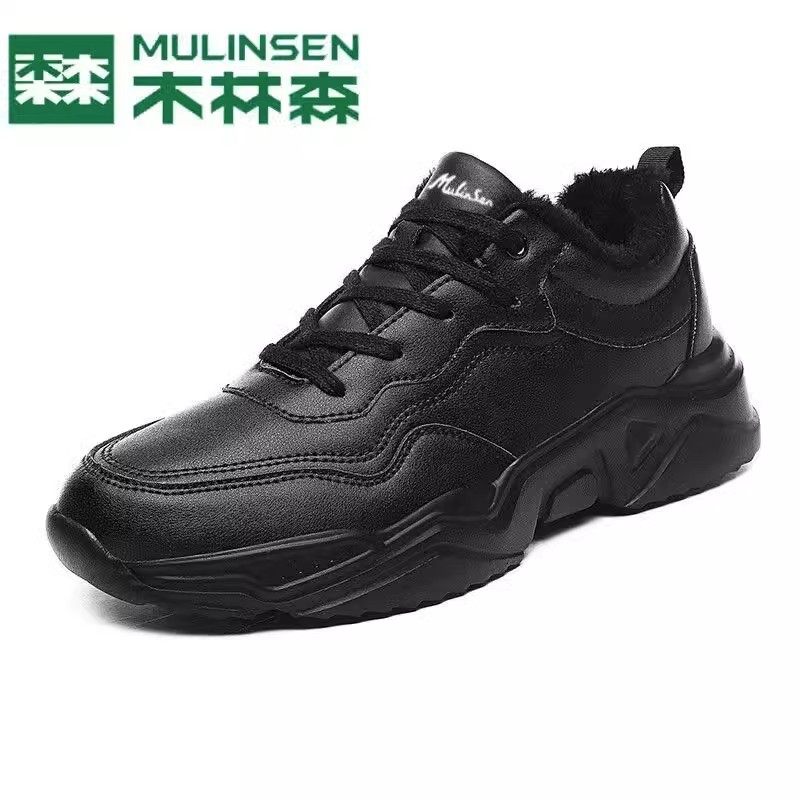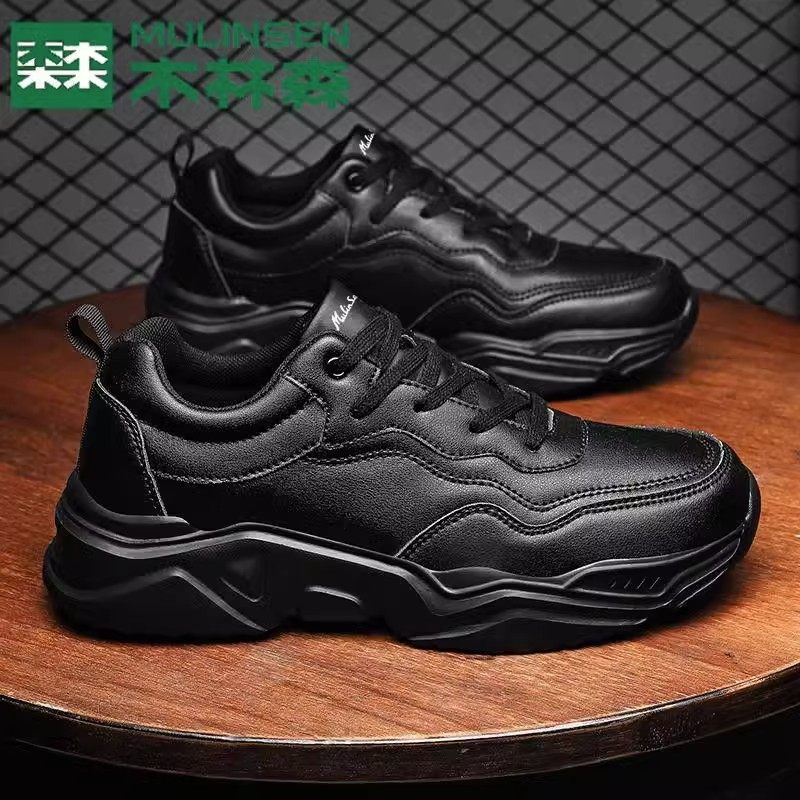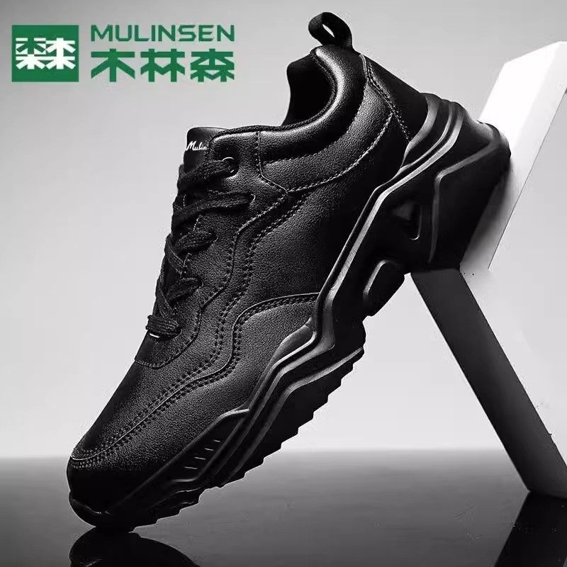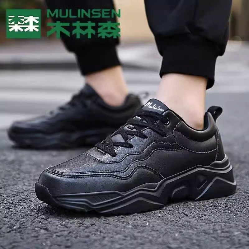 木林森官方旗舰店男鞋皮面防水纯黑运动鞋休闲软底防滑上班鞋大码