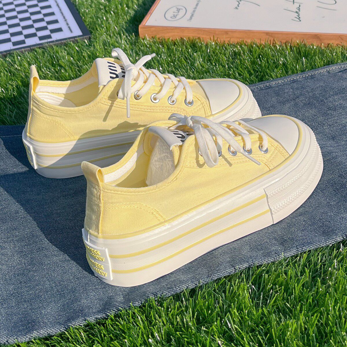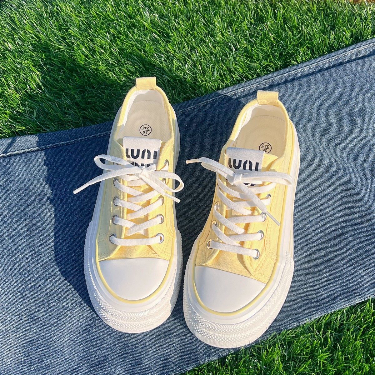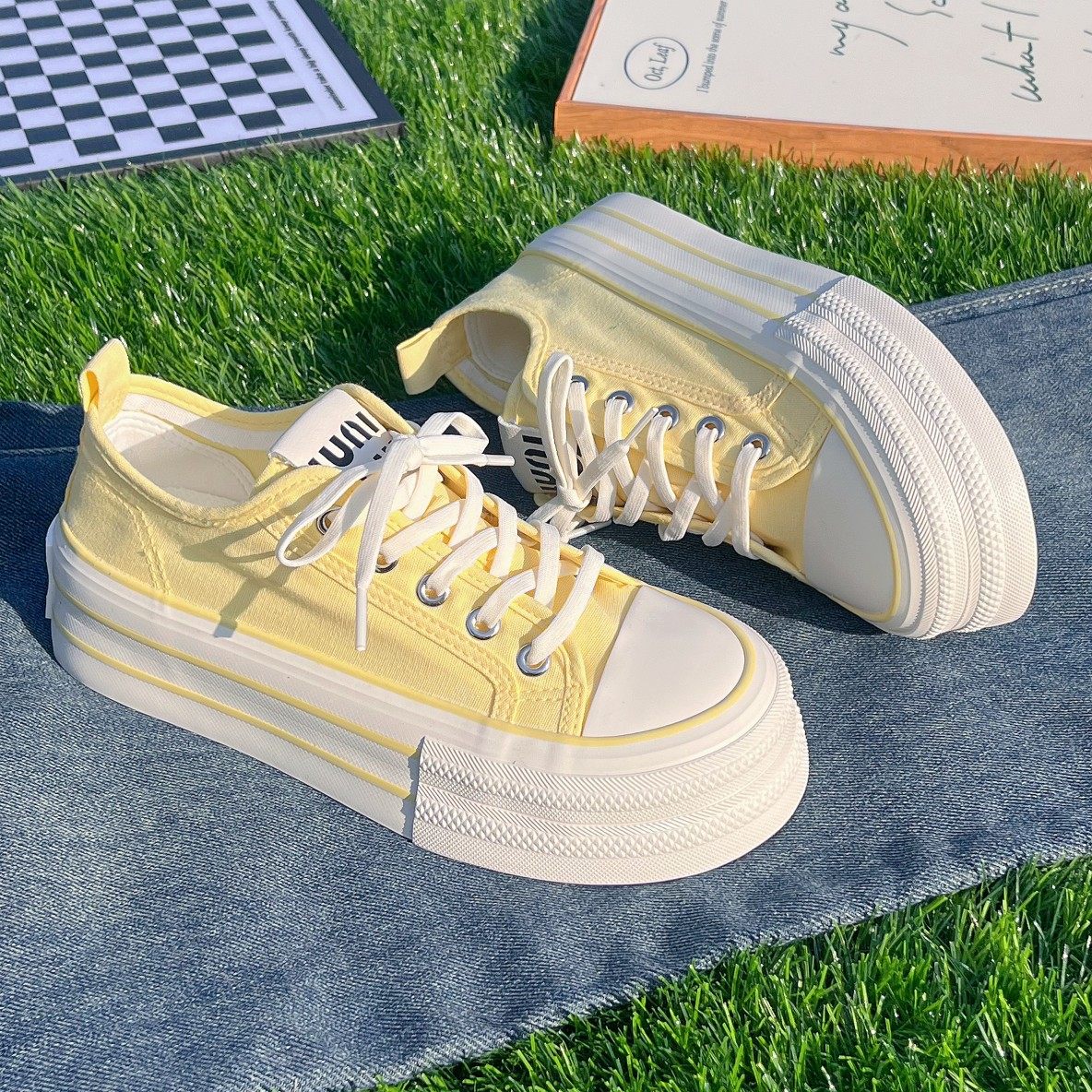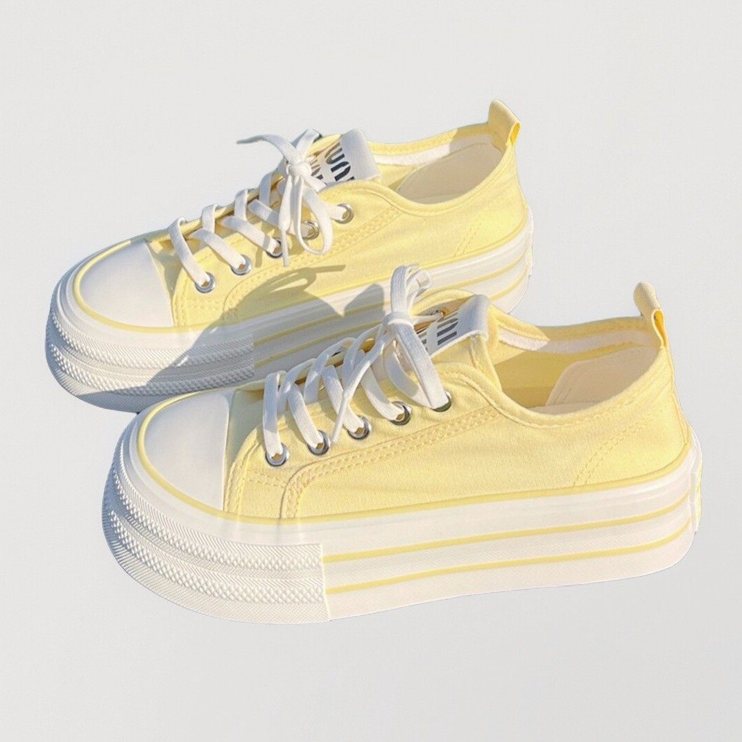 原创小众黄色厚底增高帆布鞋女2025新款春季薄款透气百搭松糕板鞋