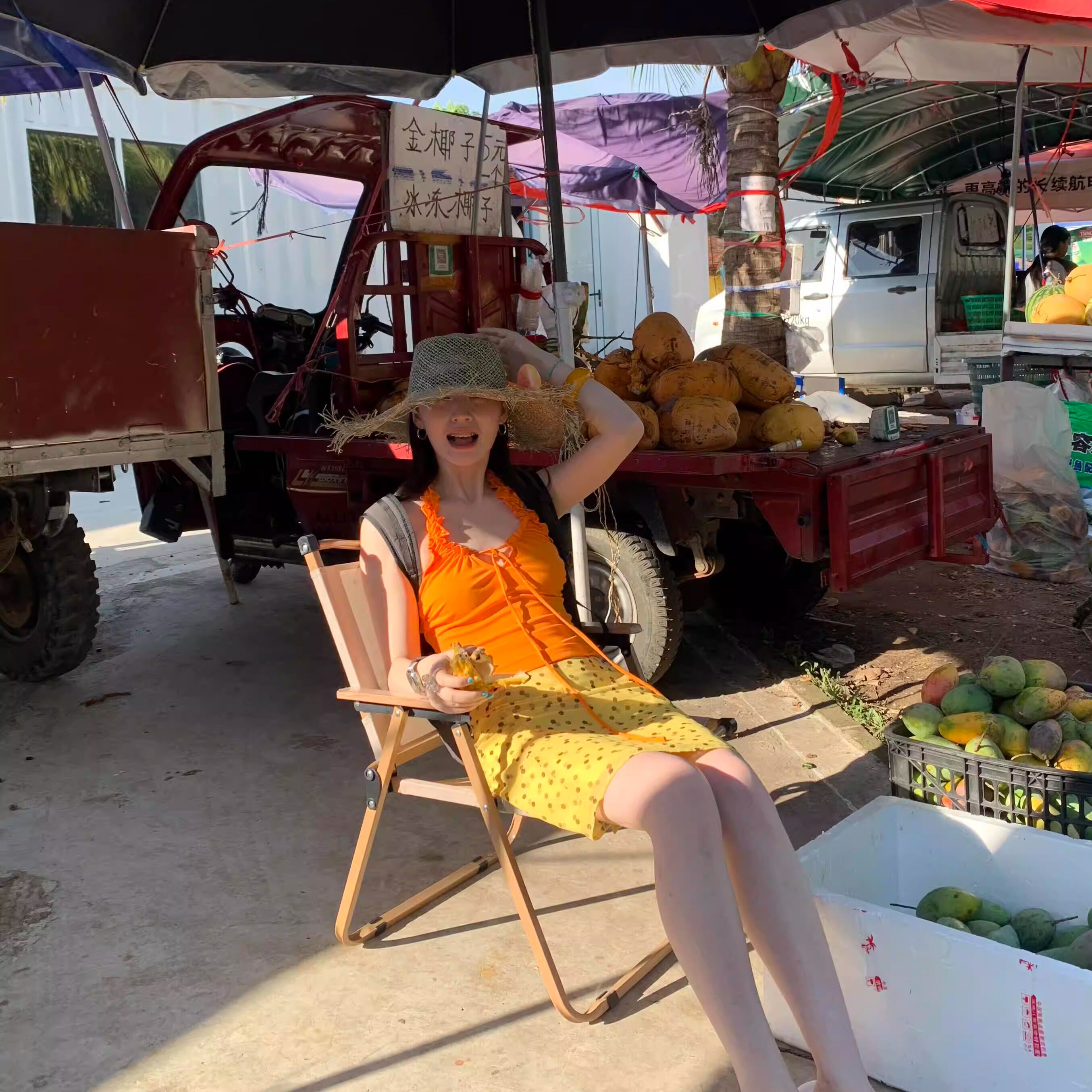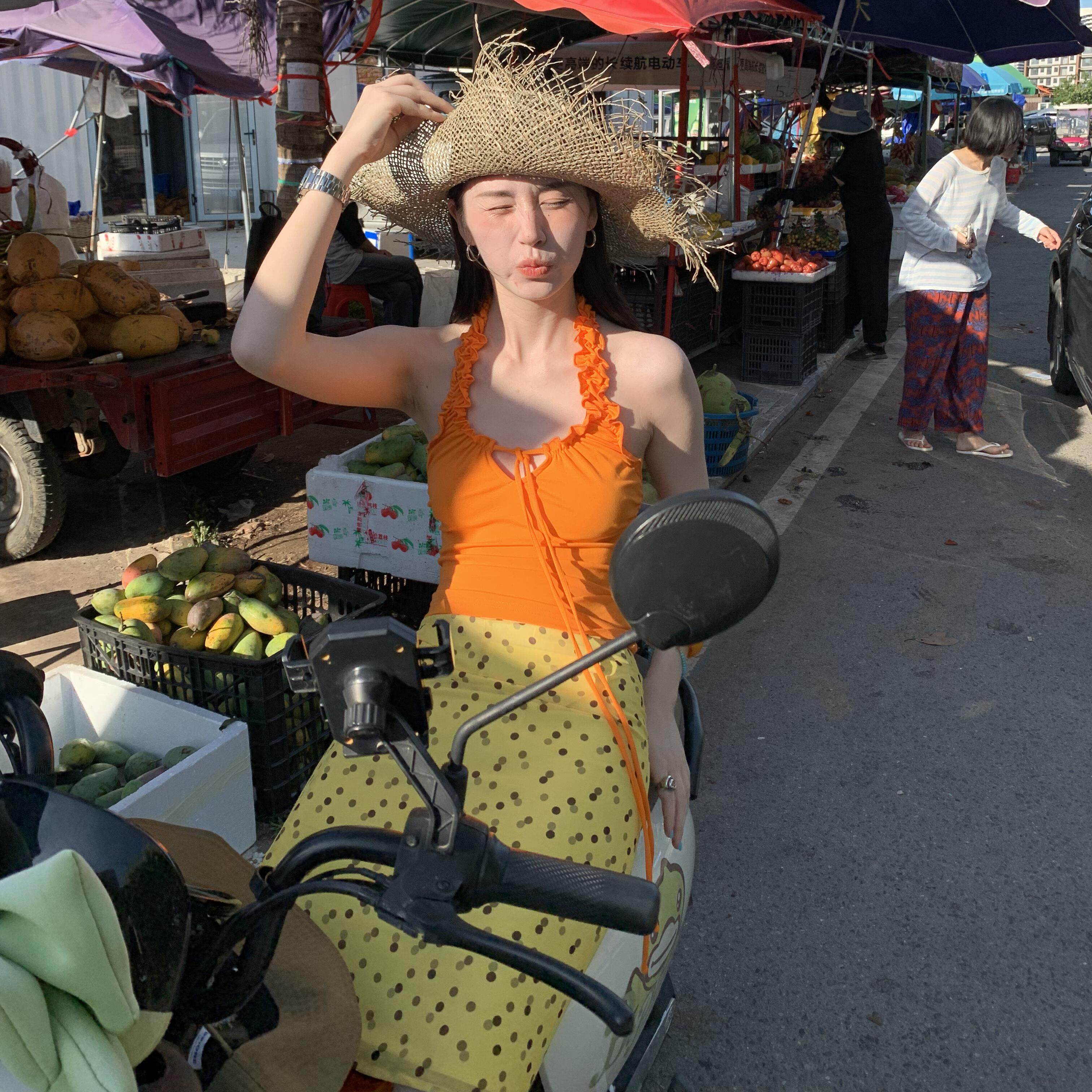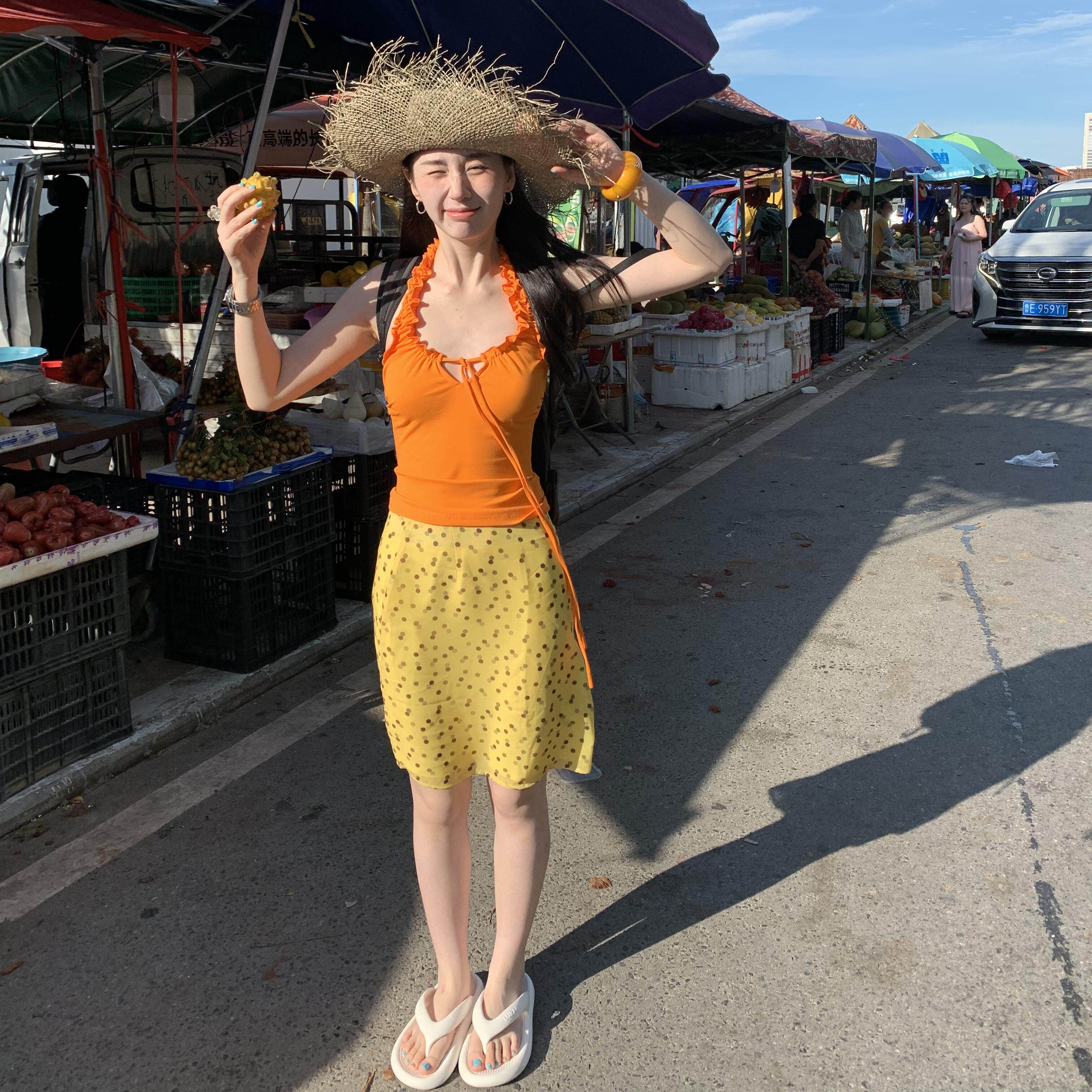 泰国三亚海岛旅游度假多巴胺穿搭女夏橘色挂脖背心波点半身裙套装