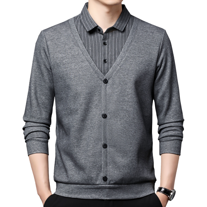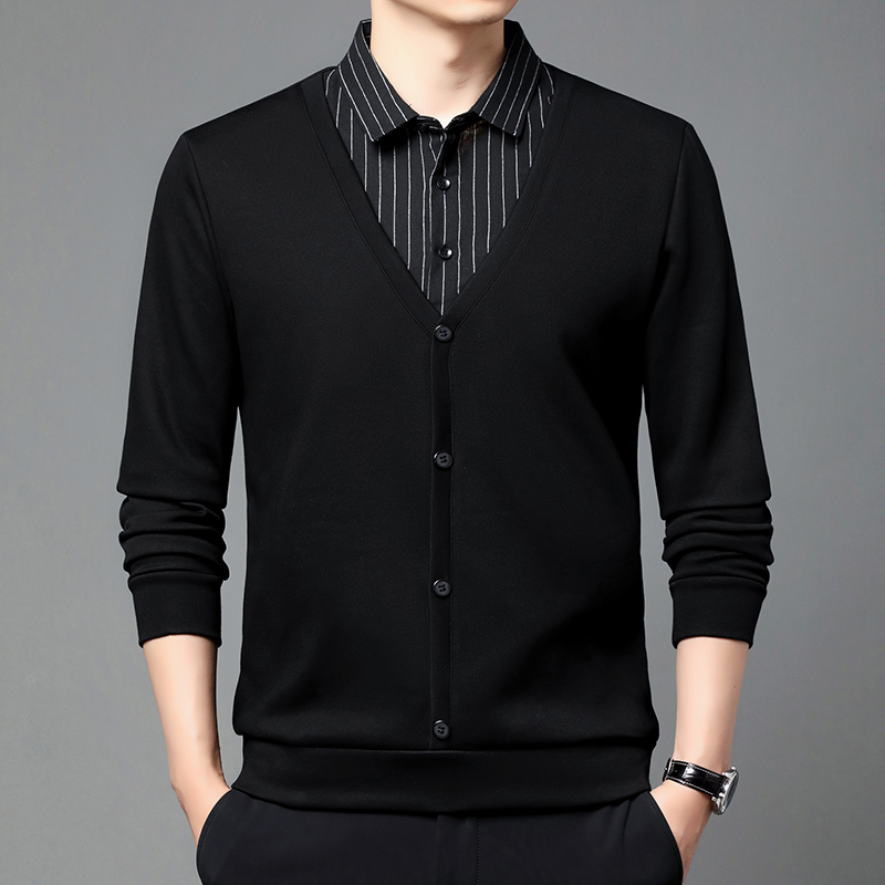 衬衫领假两件外套男装春秋季商务长袖体恤宽松版上班肥佬有领秋衫