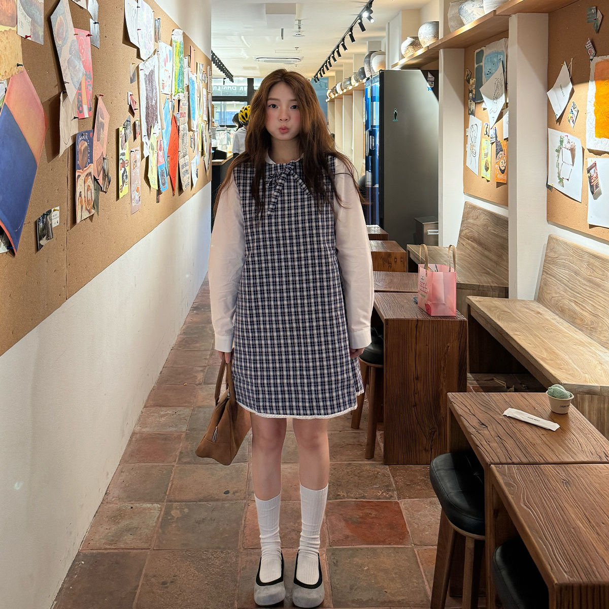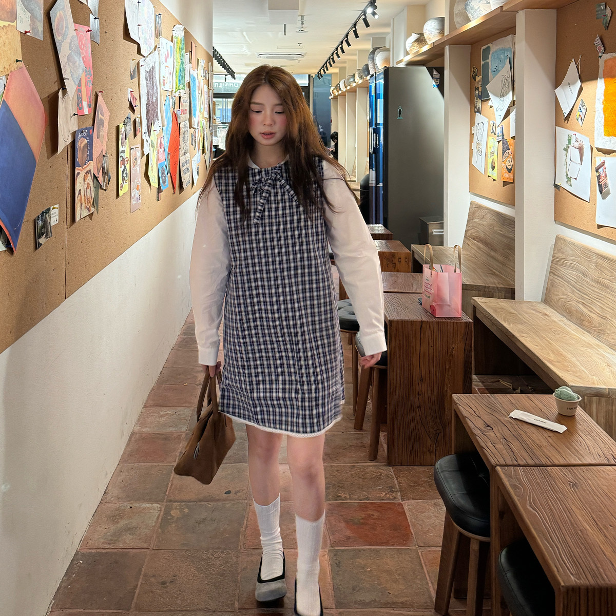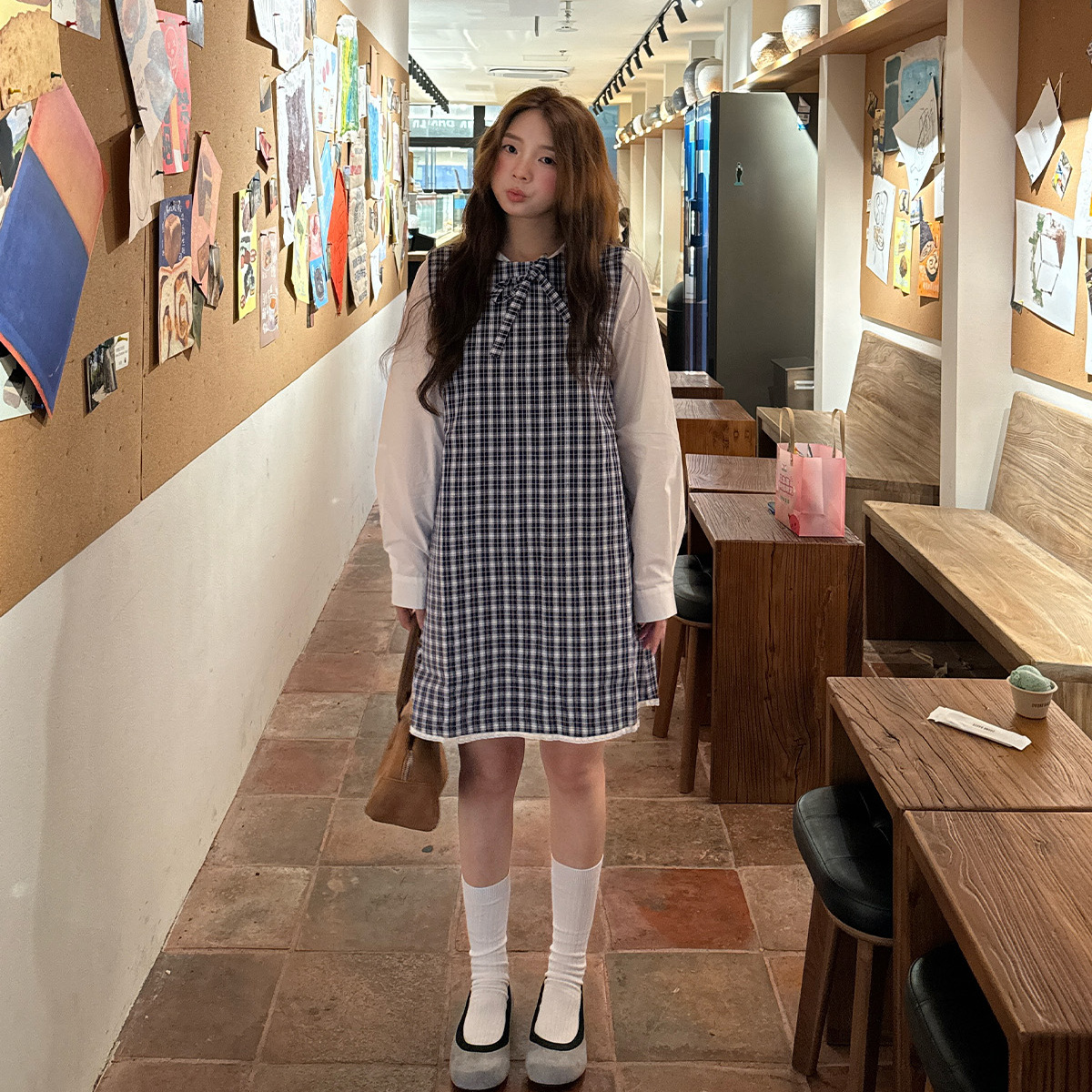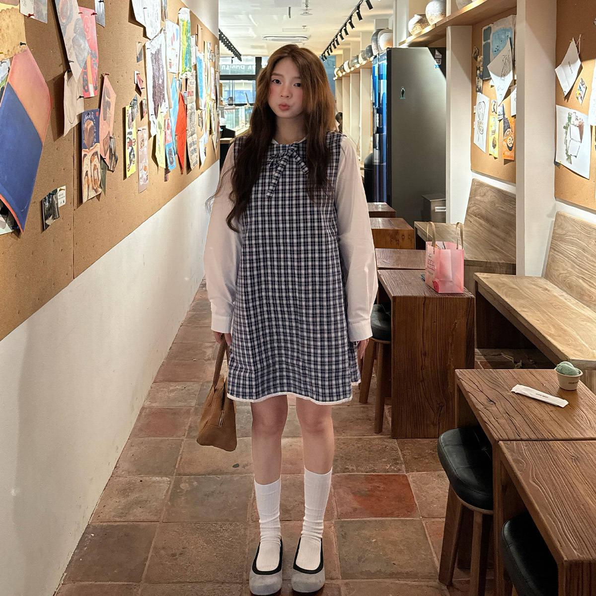 Eve H 2025秋冬新品韩系格子复古蝴蝶结背心裙拉链连衣裙女