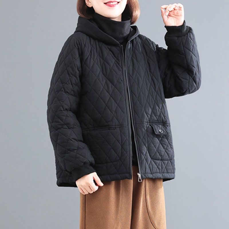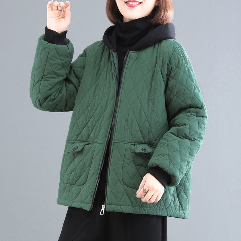 秋冬装新款复古文艺大码加厚连帽棉衣外套女菱格棉袄夹棉保暖棉服