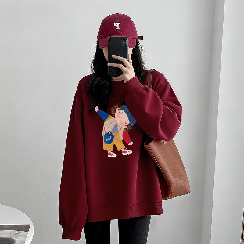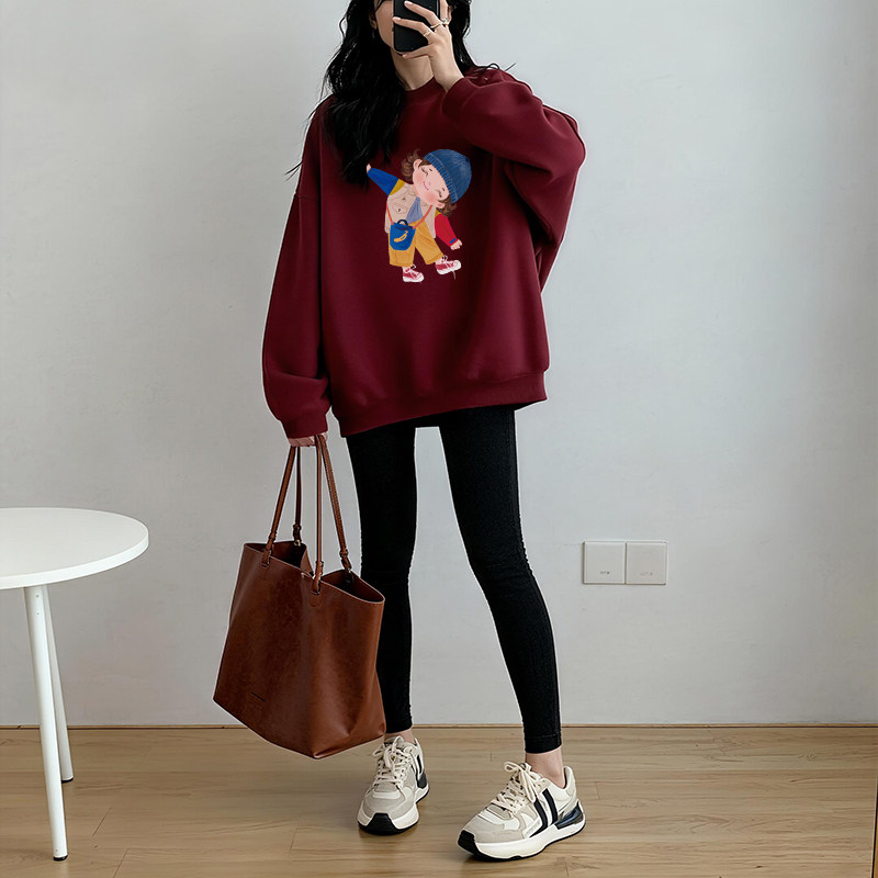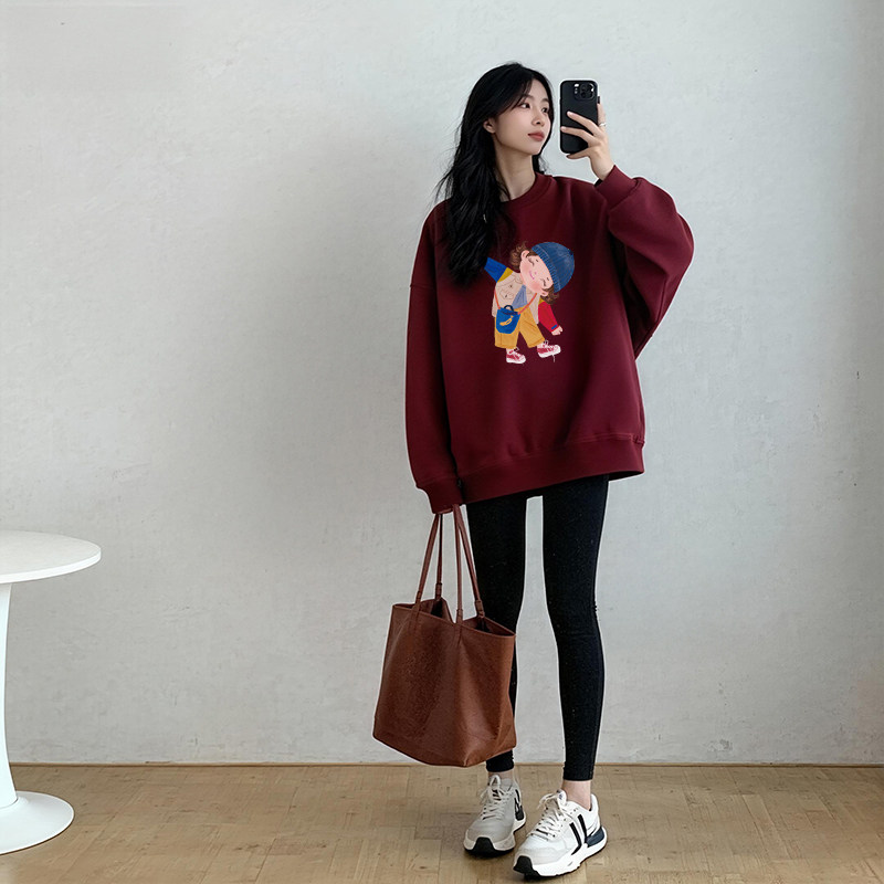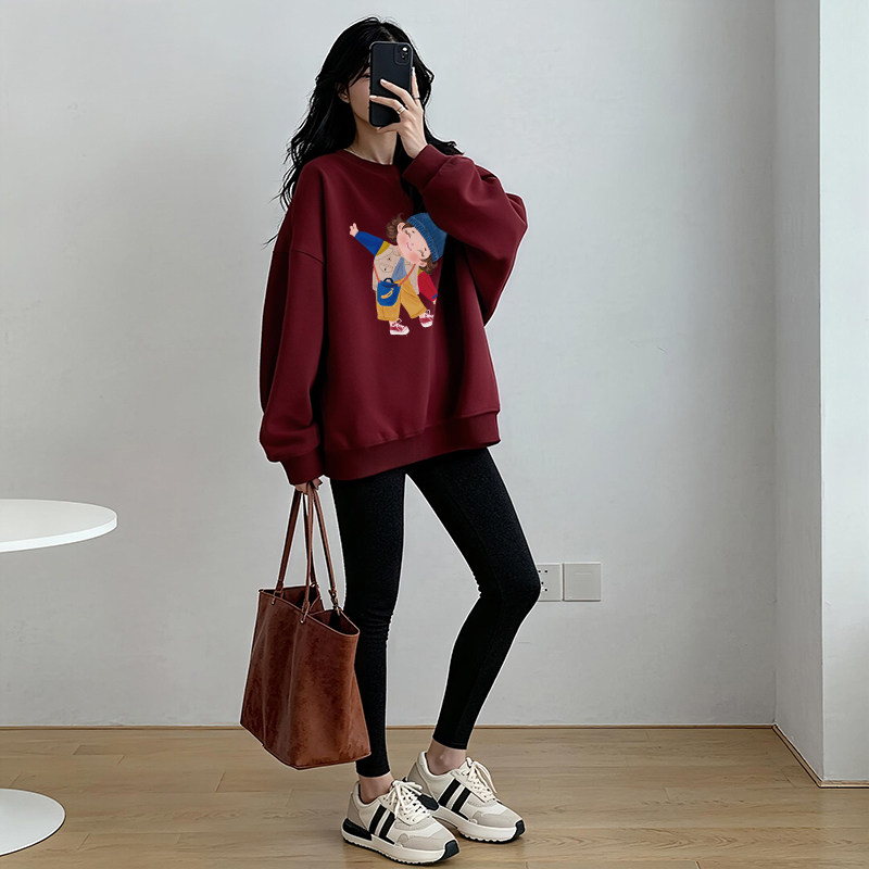 加绒卫衣女款2025新款无帽圆领套头宽松慵懒风配鲨鱼裤的红色上衣
