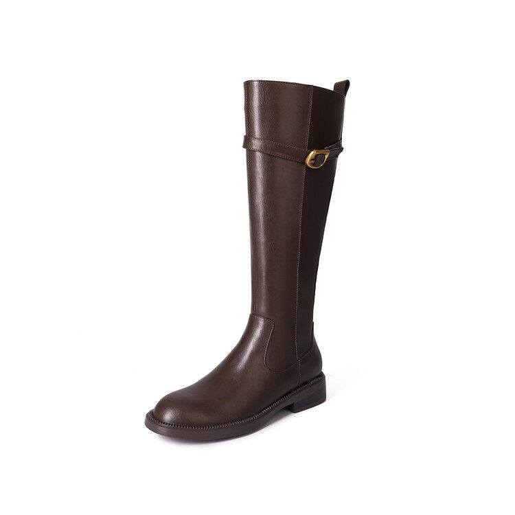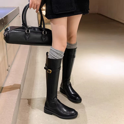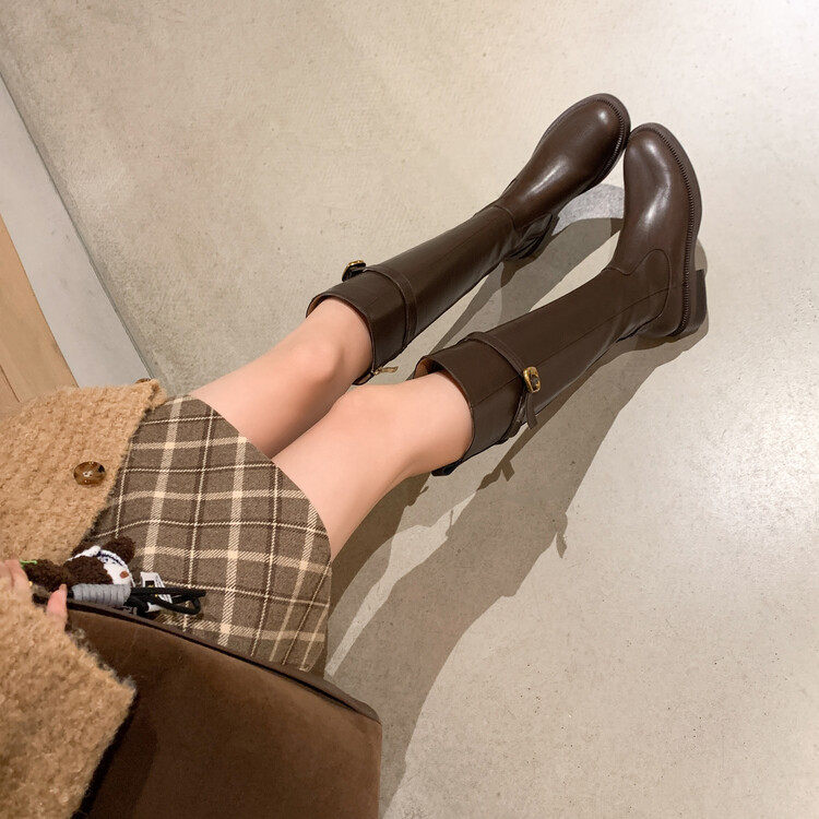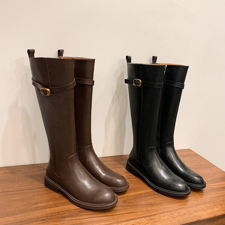 狸小然英伦风皮带扣黑色高筒靴女不过膝棕色长靴真皮平底骑士靴