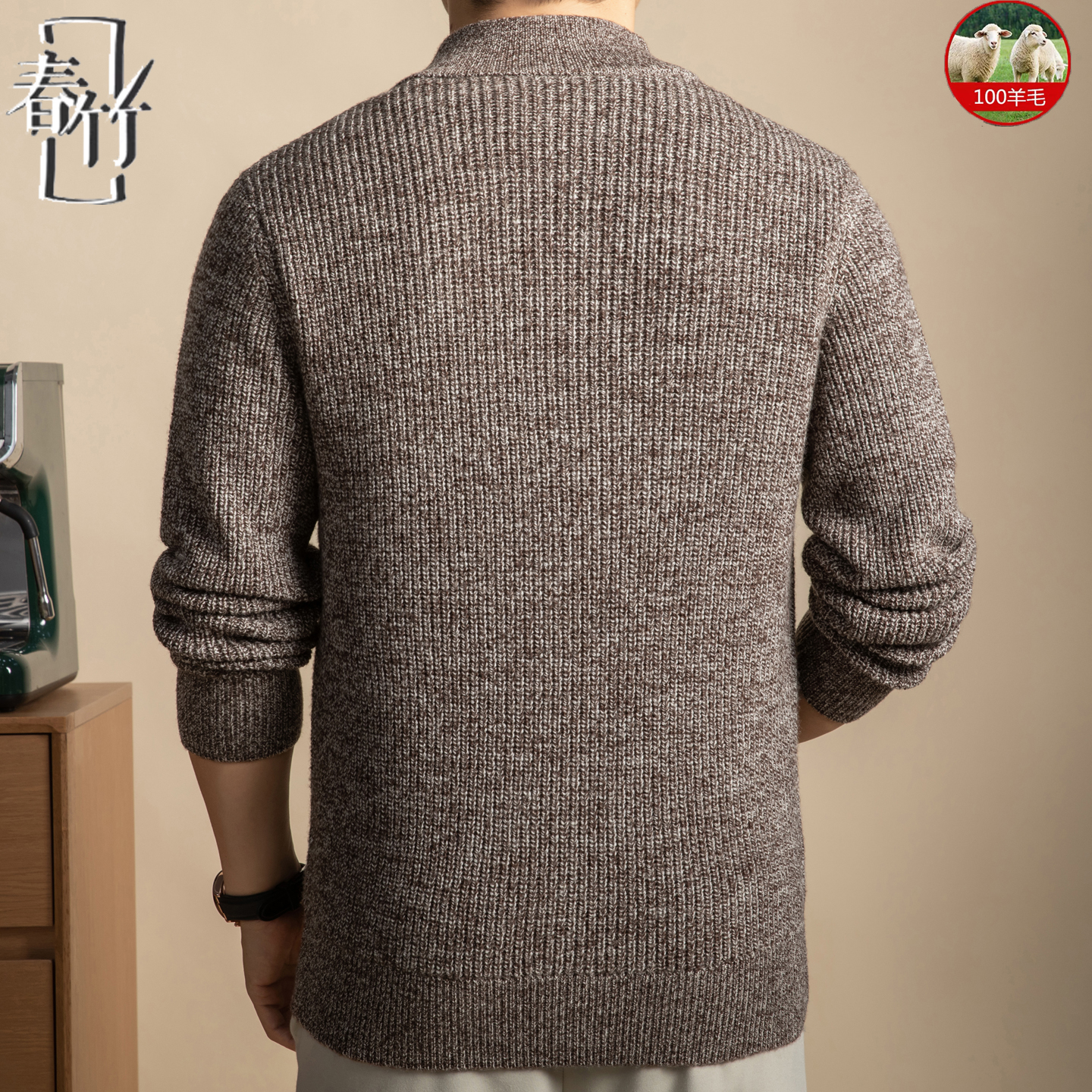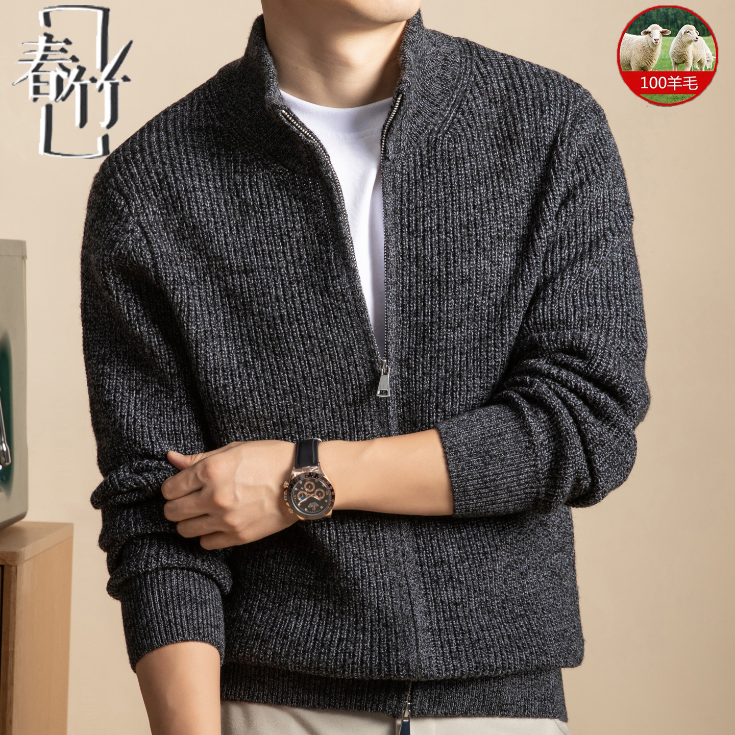 春竹半高领男士毛线衣开衫冬季100%纯羊毛针织衫保暖宽松拉链外套