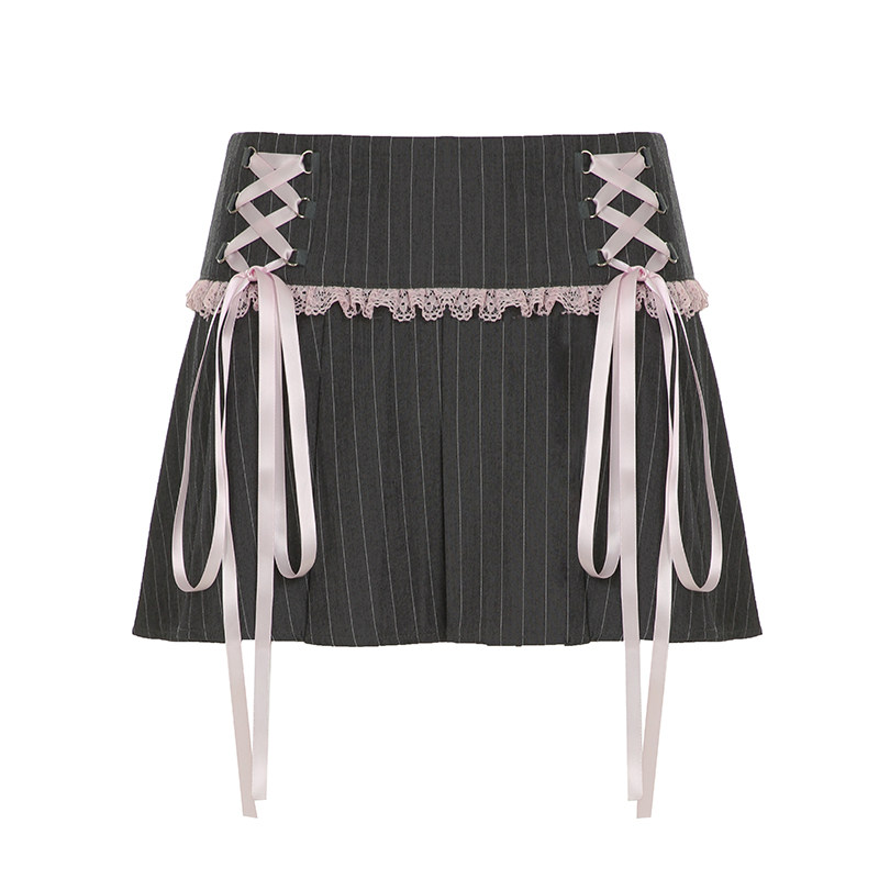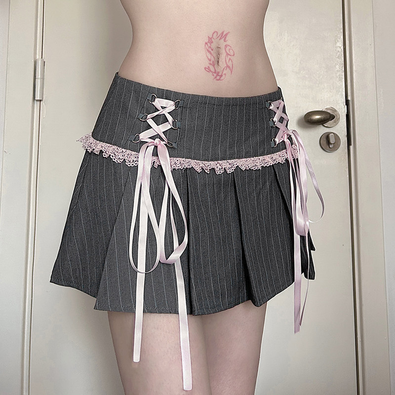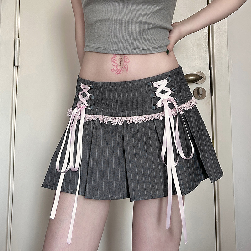 ROCKMORE【美校复古】甜酷风串绳系带蝴蝶结半身裙蕾丝拼接A字裙