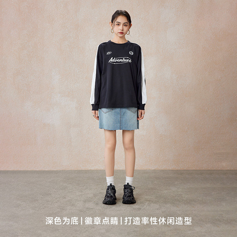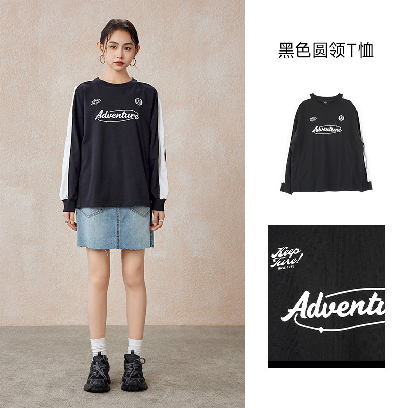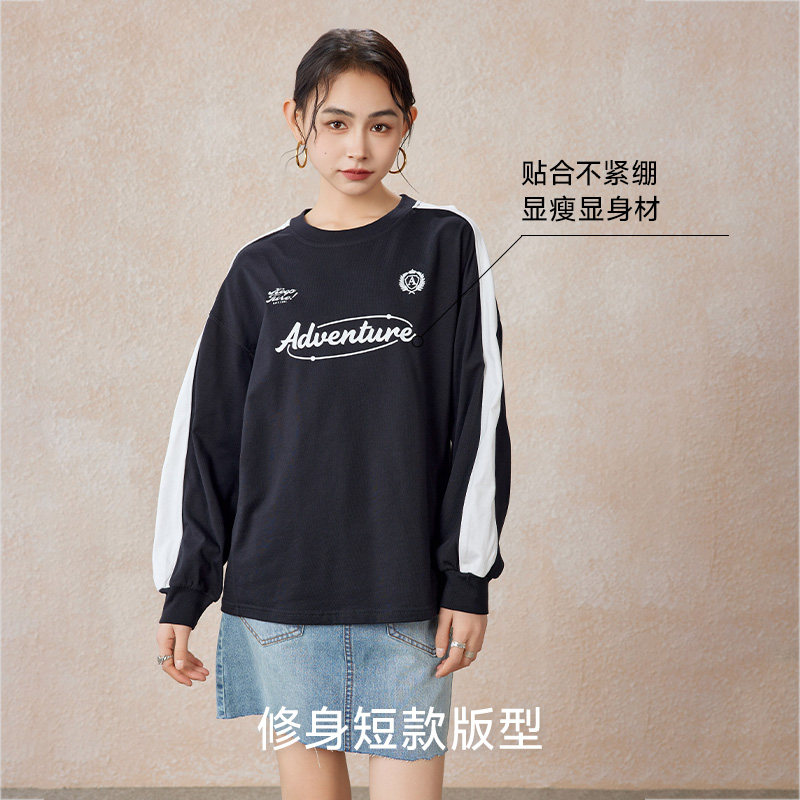 A21女装针织宽松圆领落肩长袖T恤秋季新款美式条纹撞色情侣衫通勤
