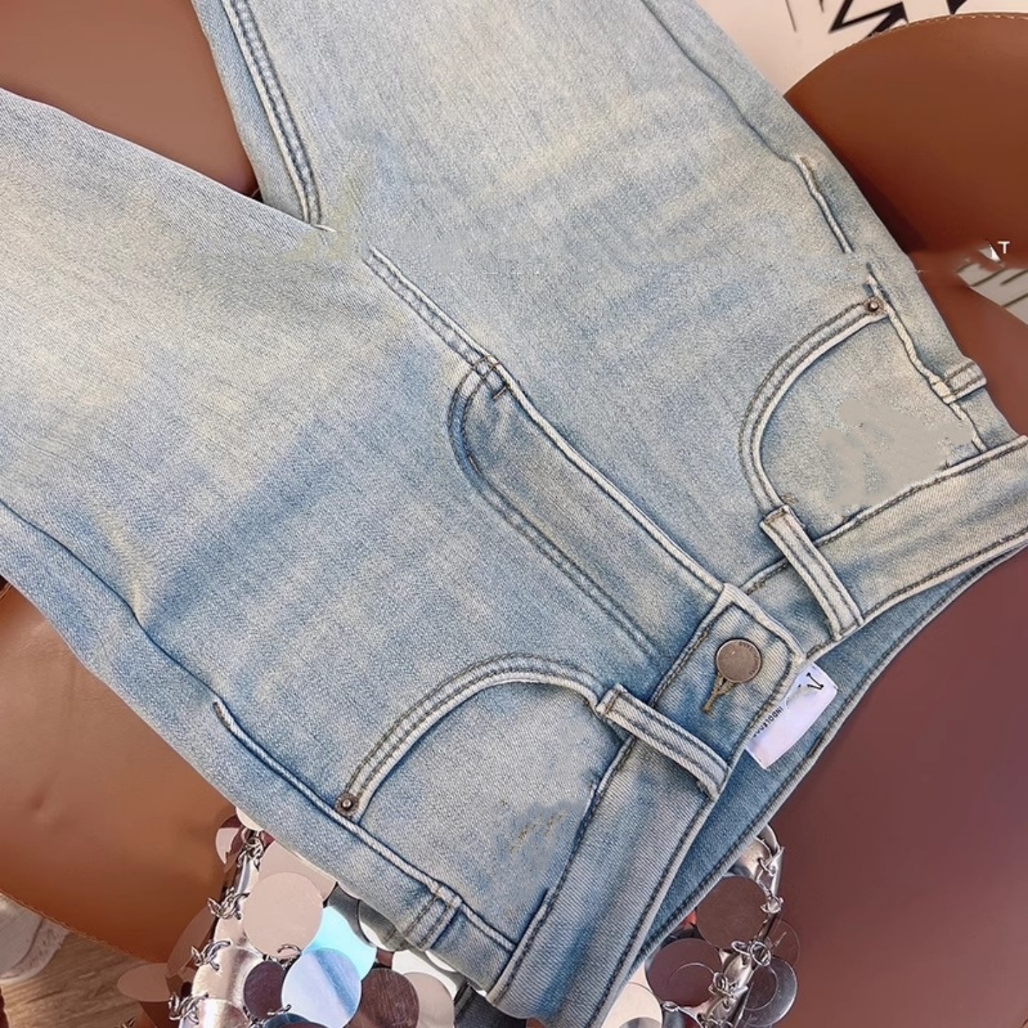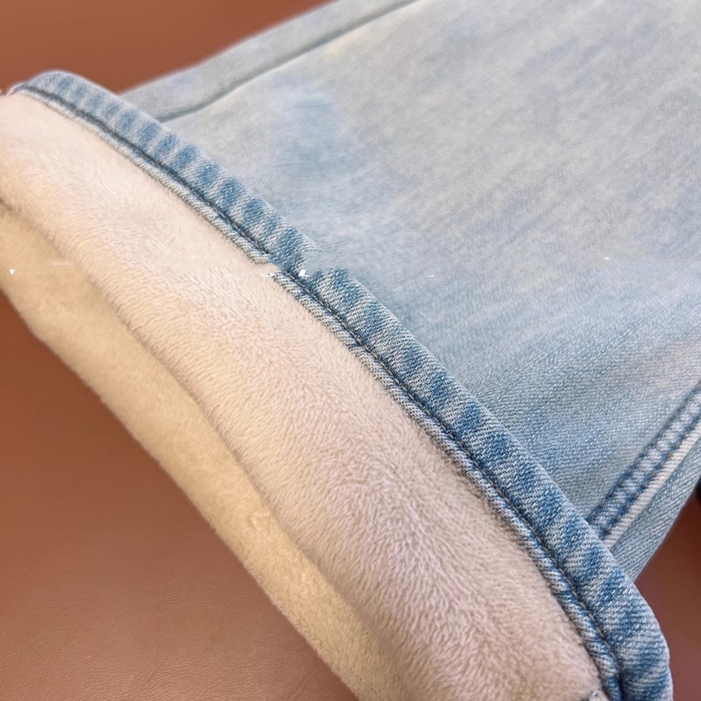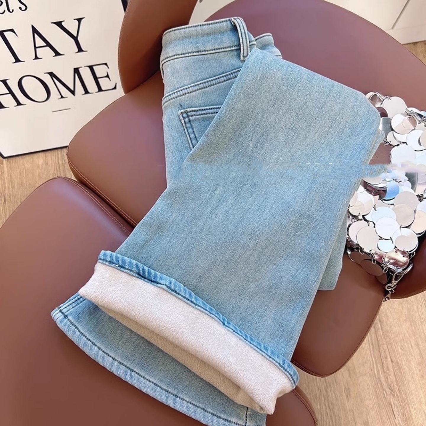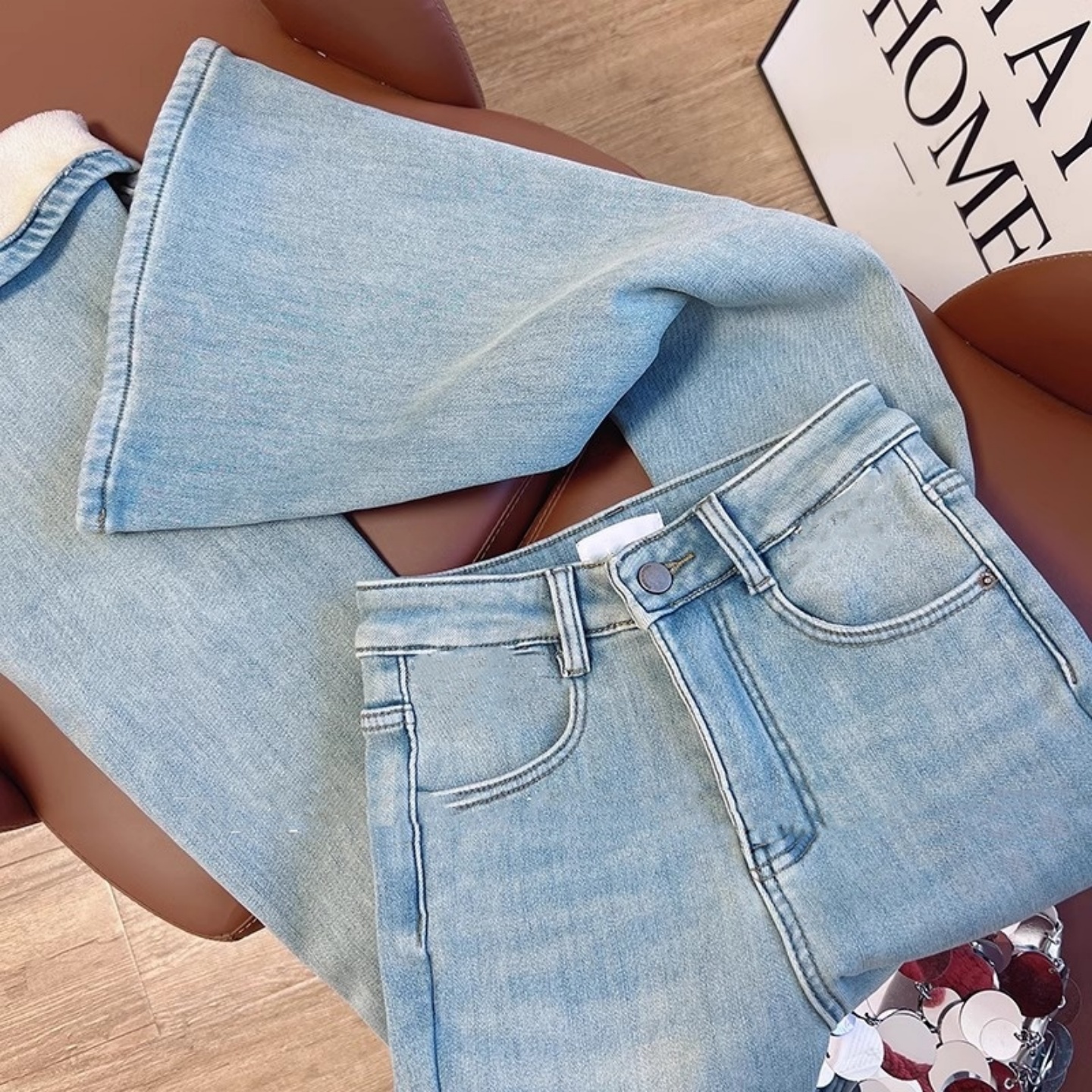 秋冬浅蓝色加绒复古微喇叭修身牛仔裤女春秋高腰显瘦紧身马蹄裤