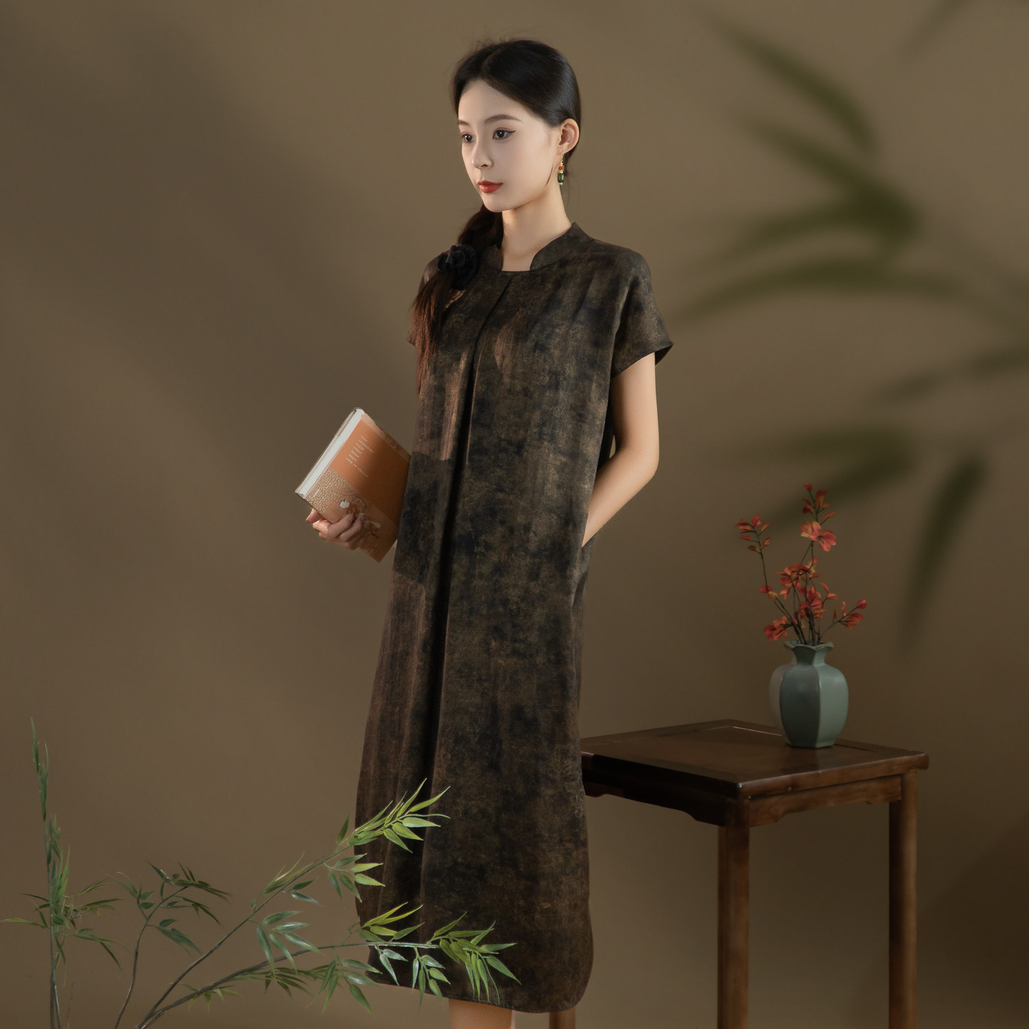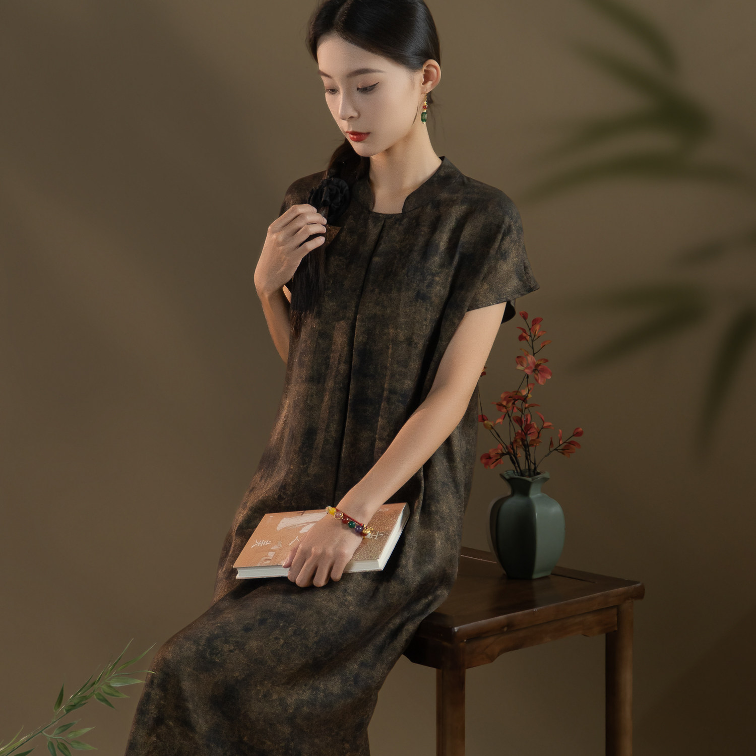鎏金-桑蚕丝重磅老料香云纱双非遗缎龟提花墨池鎏金旗袍连衣裙