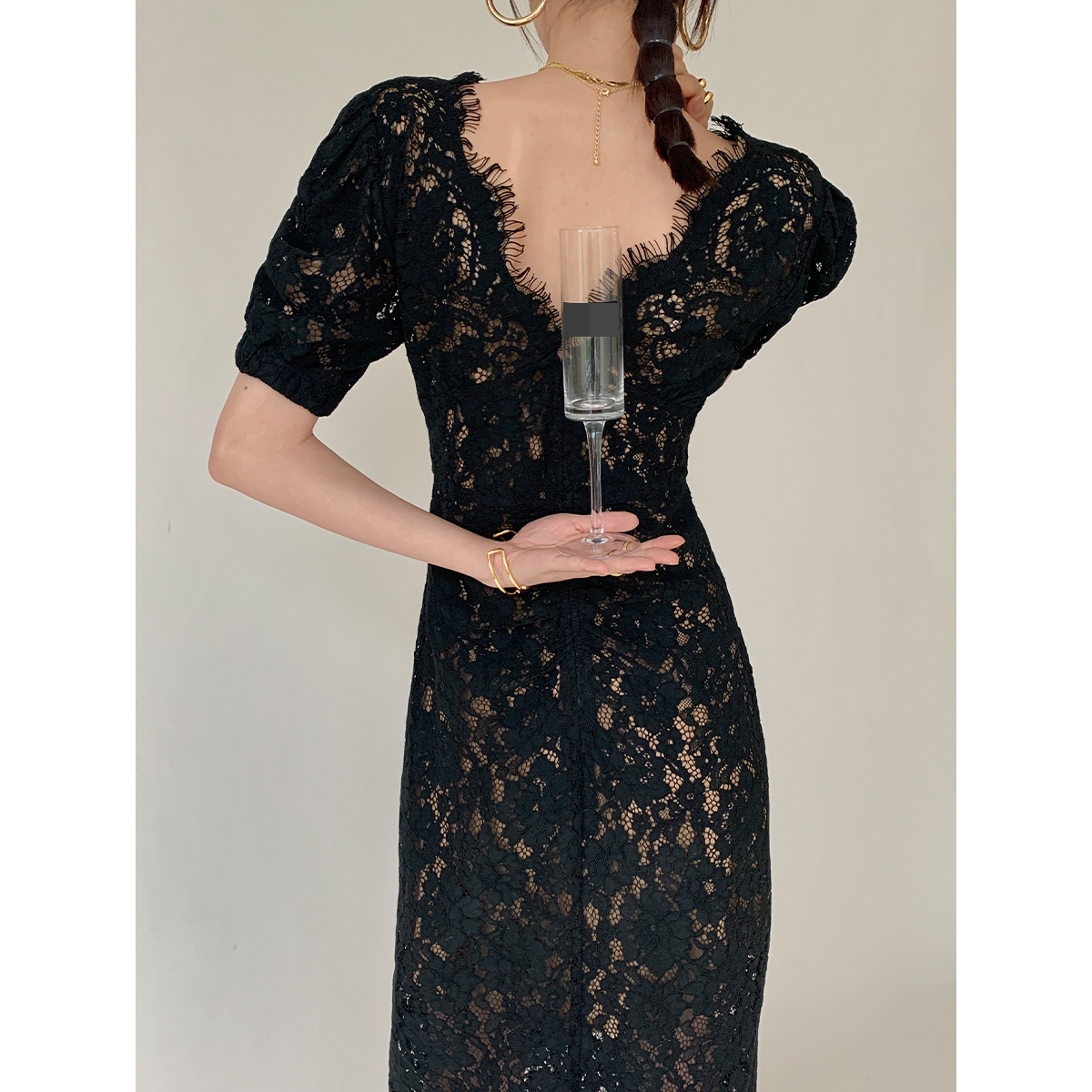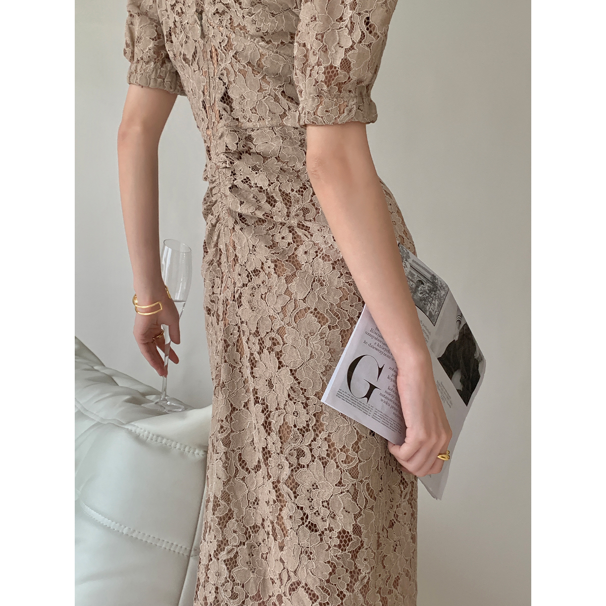 PAPERLLL辛间蕾丝短袖连衣裙女夏设计感收腰显瘦气质薄款过膝长裙