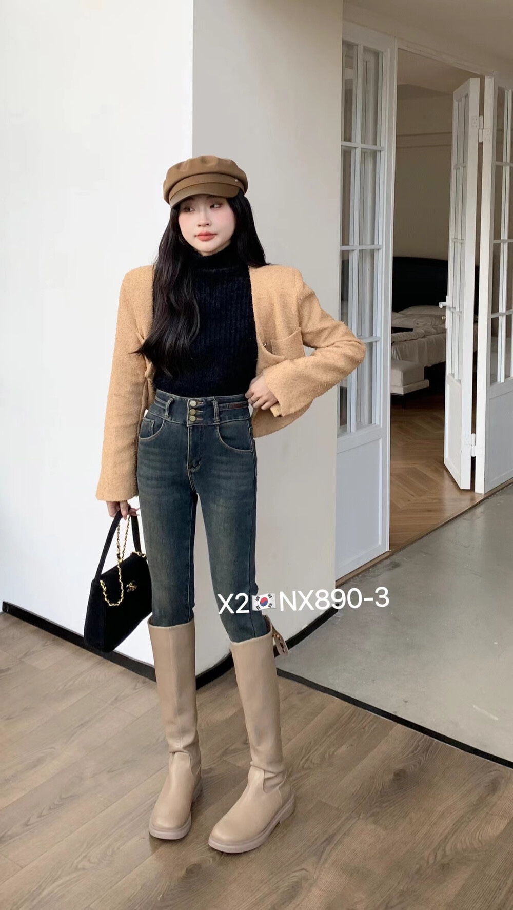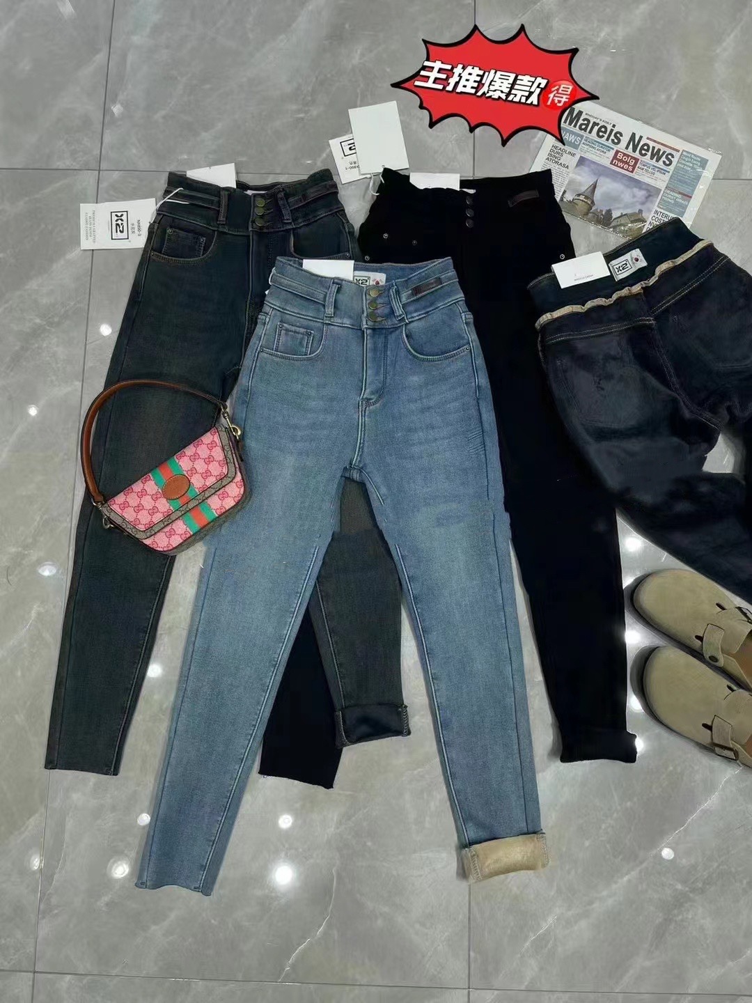 秋冬主推爆款重工高腰收腹复合绒加厚显瘦修身小脚牛仔裤女装保暖