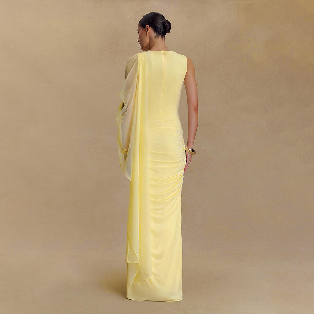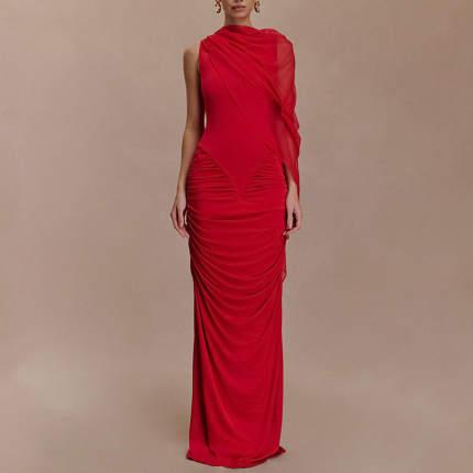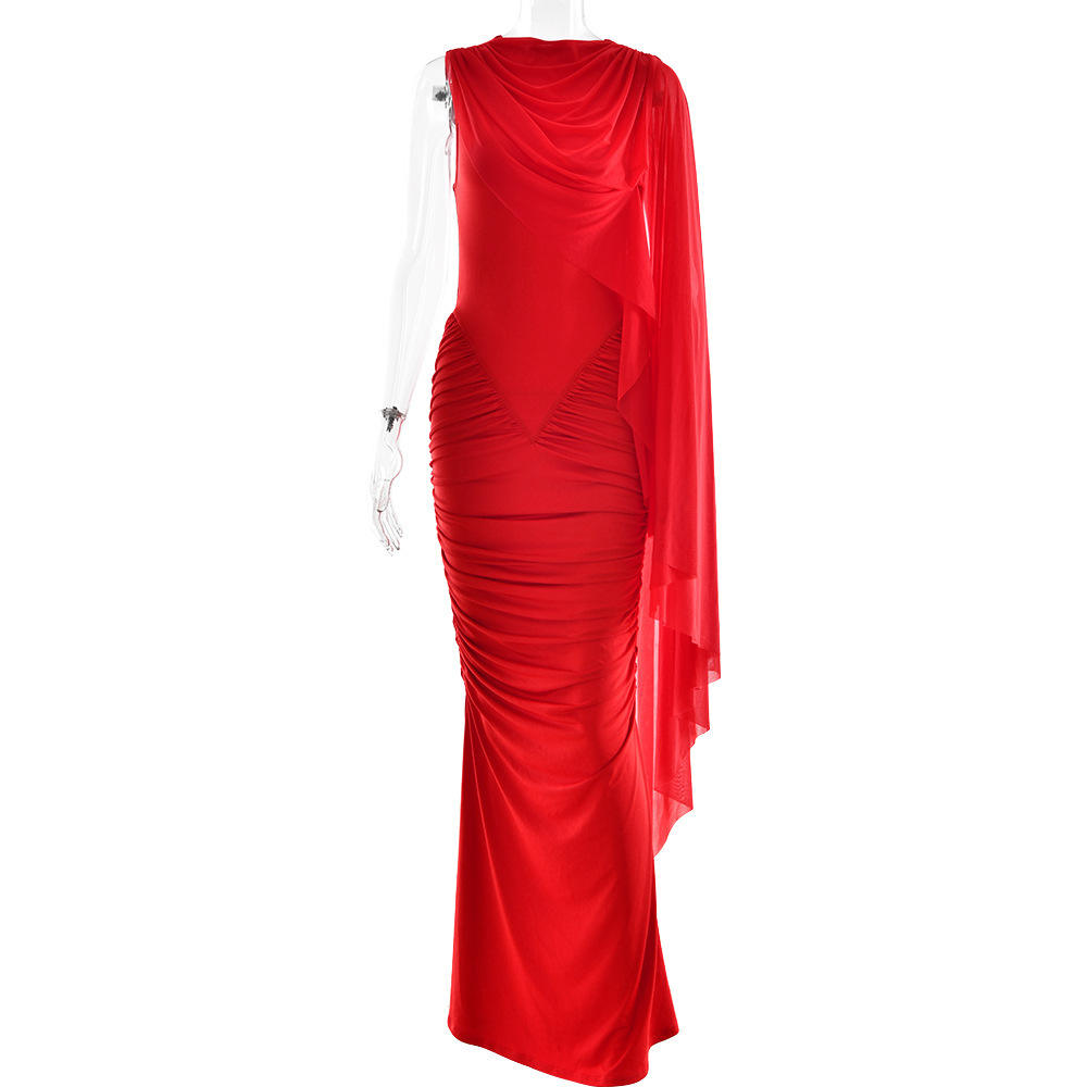 新款亚马逊时尚网纱披肩长裙欧美性感包臀圆领修身连衣裙单件